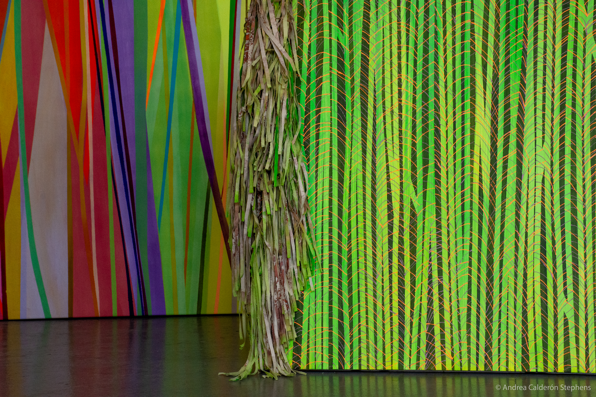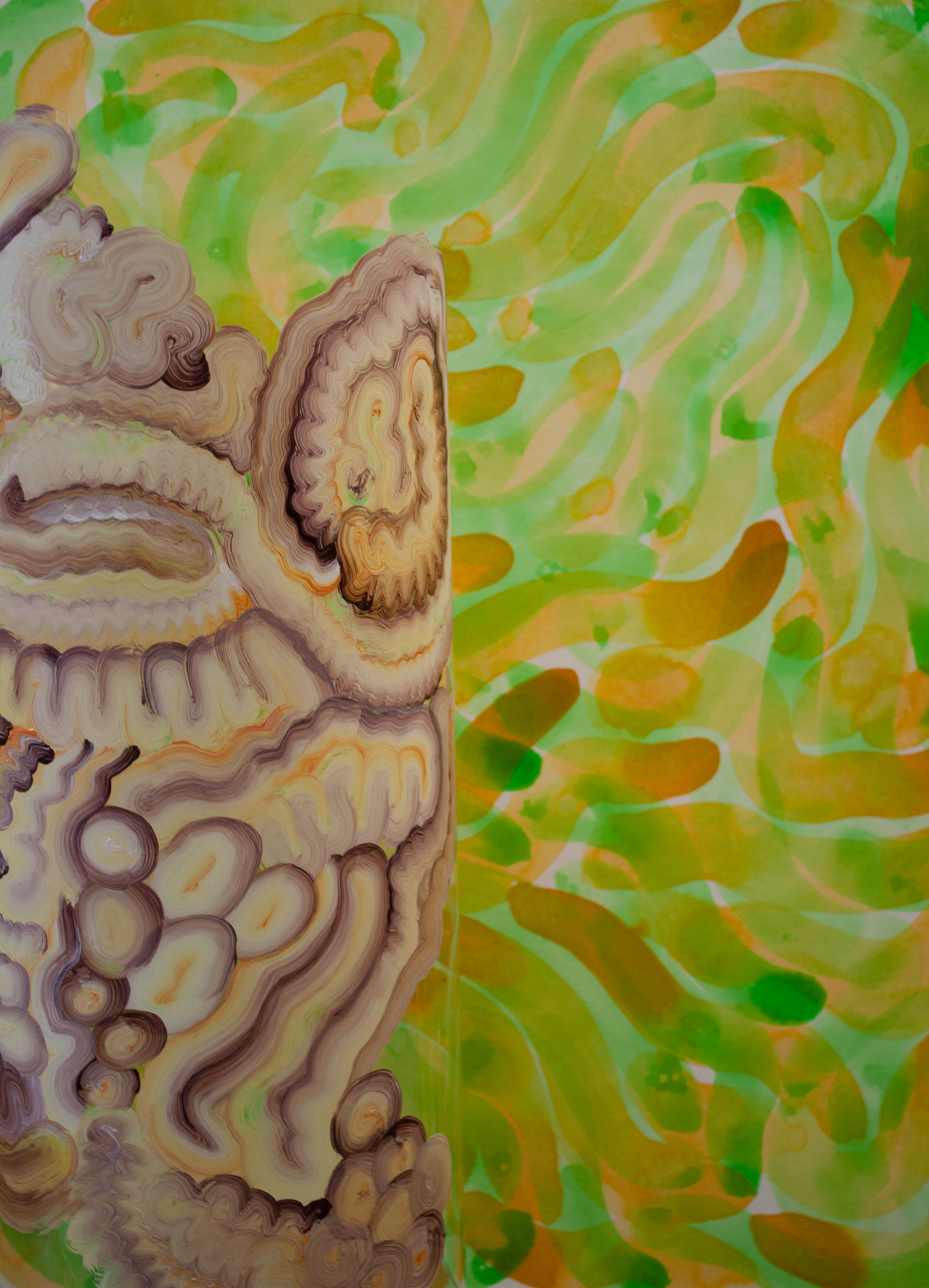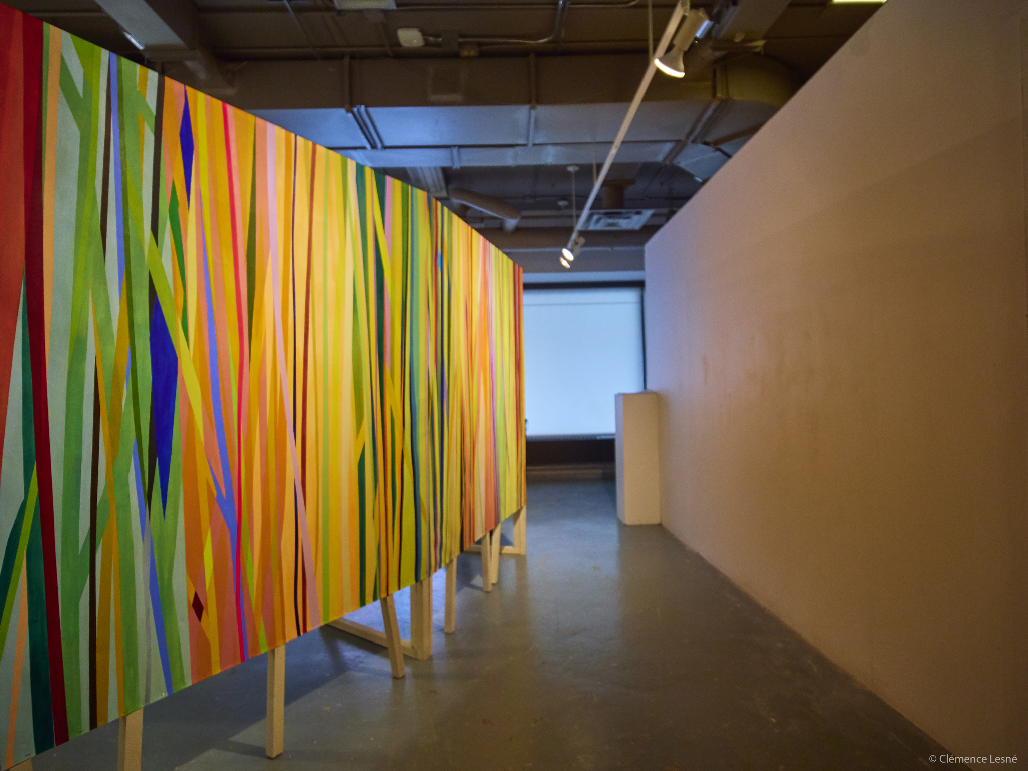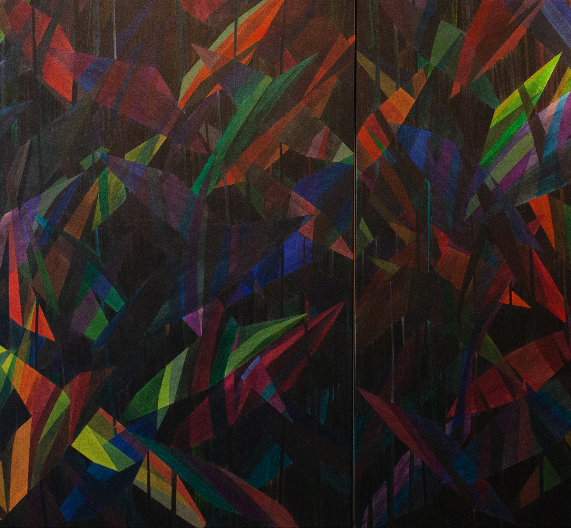 Mes mains au travail transforment la toile et fragmentent la surface. Les traces de mes gestes s’y additionnent. Les effets hasardeux de la matière s’y impriment. D’étranges motifs s’entrelacent et entre en tension. Les couleurs foisonnent. Désorientée, l’instabilité des surfaces peintes brouille notre vision. Les formes sauvages prolifèrent.Iels cohabitent.