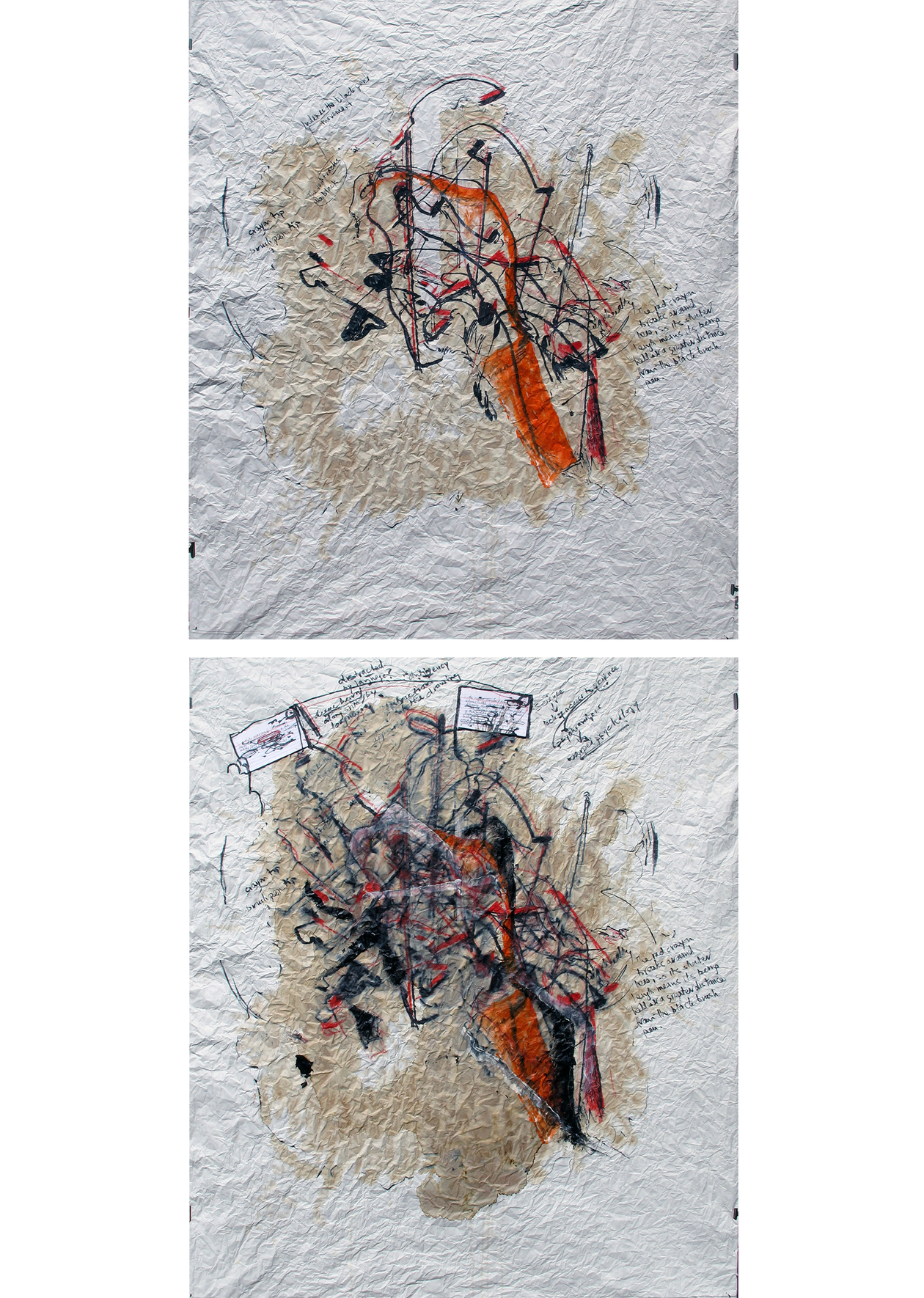 Hand Drawing Hand State 3b (lower image) Ink, Acrylic, crayon, coffee stain on crumpled tablecloth paper, 100 x 118cm, 2022