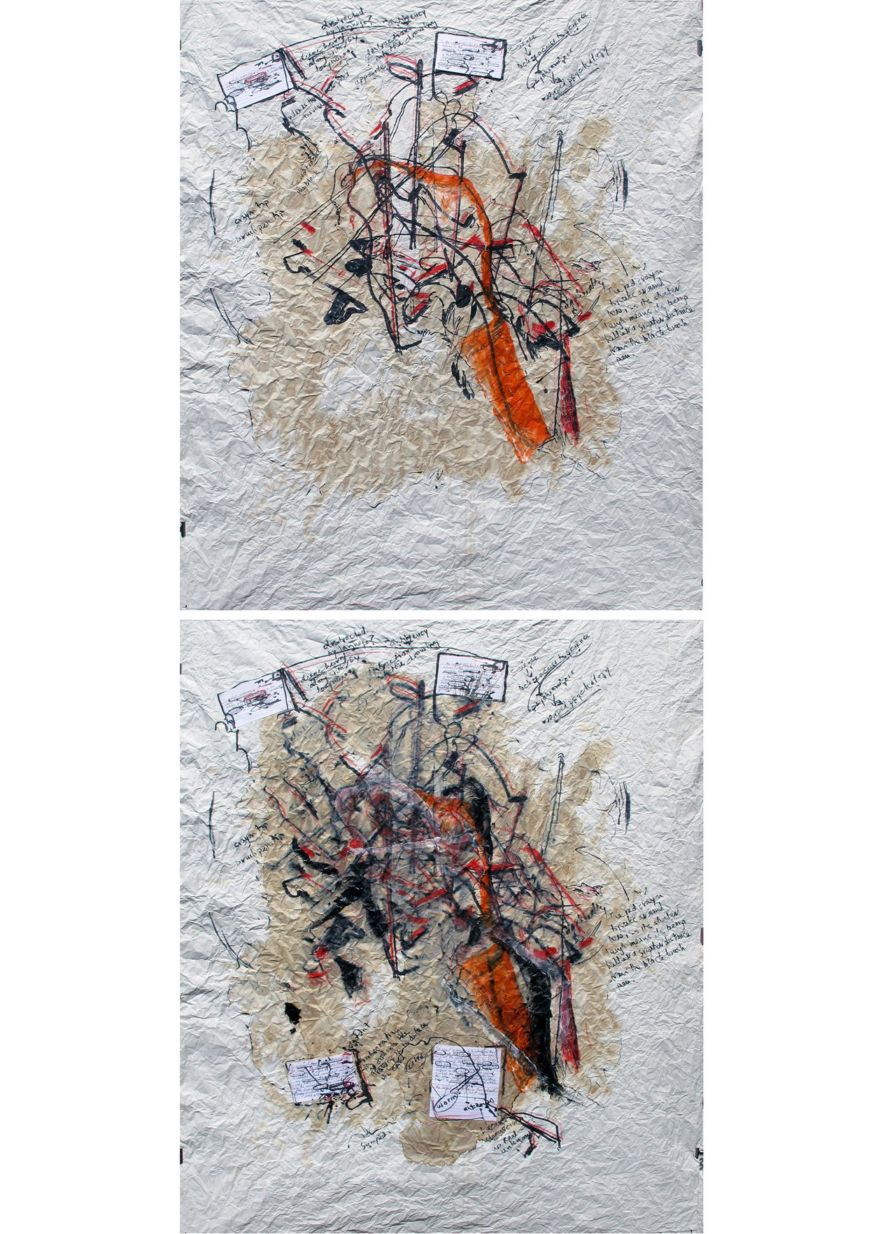 Hand Drawing Hand State 2 (upper image), Ink, Acrylic, crayon, coffee stain on crumpled tablecloth paper, 100 x 118cm, 2022