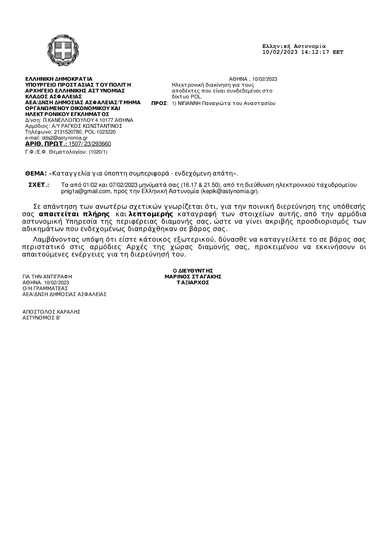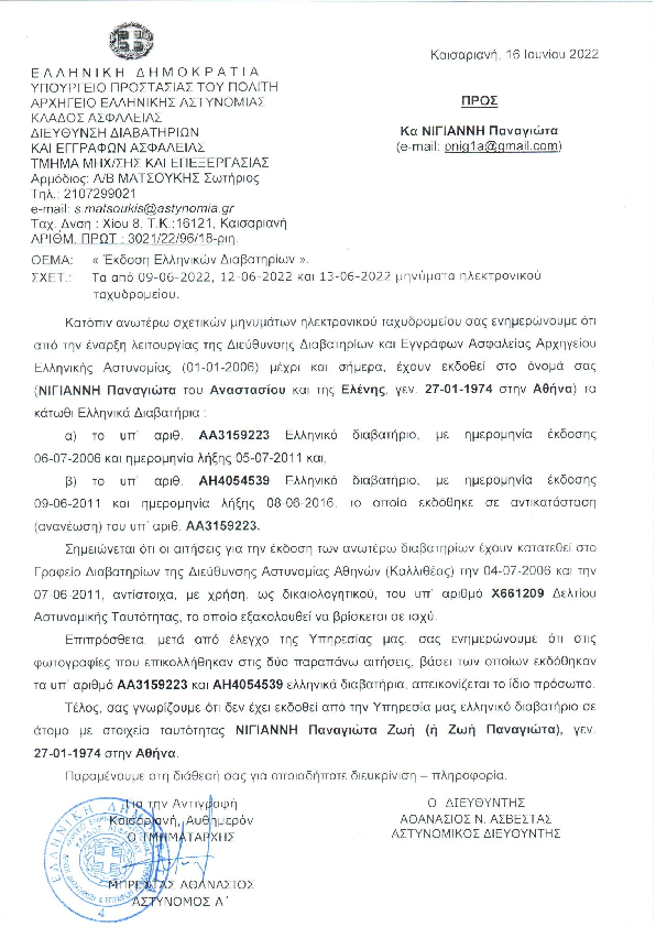 Letter from the Greek Police Chief, Organised Electronic Crime Division, and the Greek Ministry of Transport dated January 2024, stating that my VALID Greek driver's license, issued in 1994, in my legal name at birth, Panagiota Nigianni, is registered under my tax number, also in my legal name at birth, in my native Greece. The letter further states the obvious legal: the number of the driver's license is UNIQUE, like all driver's license numbers - like all numbers, which are part of an individual's so-called PERSONAL DATA; they can't be stolen and used by others, amounting to theft of personal details. I received this letter, after I reported to the Greek police the theft of the number from my driver's license, advised by the Dutch police. The letter from the Greek Chief addresses me as Zoe Panagiota Nigianni, recognising the legal change of my name in the UK, as a British national, via deed poll, in spring 2021.