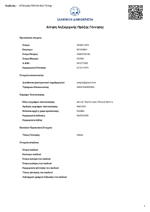 The documents below show my registration at the Malmo municipality, in Sweden, as a Greek citizen: meaning with my Greek passport that shows my legal name at birth, Panagiota Nigianni, as it appears on my birth certificate. There are no children; liikewise, in the Greek government document from my native, also confirmed again in September 2024 by the Greek police. Additionally, the document shows that I went to live in Southampton, in the UK, at a private address, after I left Sweden. I worked at the Winchester School of Art, as a British national, from 2012 until, formally, early 2016, though I left the UK in the summer of 2015.