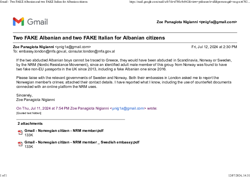 2. Despite having done all the international work from Albania and in the broader Balkans, including North Macedonia and Kosovo, countries that I had never visited before 2024; as well as in Italy, and getting some European countries support, such as Germany's, Sweden's and Norway's, and more recently, France's and Spain's, in 2025; since March 2024, I wasn't able to return to the UK, because of the serious identity fraud case, which, until recently, 2025, involved, amongst other, identified counterfeit documents, with my legal name at birth, Panagiota Nigianni, and my date of birth, 27 January 1974, bearing the translated in English offender's criminal profile, an identified Greek female ex-convict's, based on her profile, as well as a forged medical document, belonging to a deceased Belgian filmmaker, she used to claim fraudulently disability benefits, which the identified NRM member copied and pasted on counterfeit with fake logos, in collusion with Golden Dawn, then shared to radicalised persons, through an alt-right, affiliate, dark web US platform, connected with a group called "The Base", based in Belgium, and laterally with the NRM, which has informally denied producing those fake documents. The UK bears responsibility for those fakes, which were uploaded illegally on the Met police's intranet through cybercrime, and were handed out to a local surgery by the twin NRM members (without assistance), to an identified Greek receptionist, connected with Golden Dawn, in November 2021. These fake documents refer to fake Albanian and Italian passports, which three Greek underaged, siblings and one half-sibling, of the identified Greek ex-convict's, had in the UK, as children and teens. And, as it transpired in 2025, three additional fake EU passports: Spanish (b. 2001), French (b. 2002) and Greek (b. 2007), while their mother also had a fake Greek passport as described further below. The eldest two of those teens had gender modification surgeries in the UK, along with their half-sibling, illegally, in 2019, so the sets of fake passports could be used; there were police records with those sets of fakes, which were "CORRECTED" only recently, from spring until autumn 2025, in the persons' legal details, as Greek natives. In fact, before that, the fake records for supposed Italian and Albanian citizens were replaced by more fake records by the use of a fake Spanish (b. 2001) and a fake French (b. 2002), both in my name known as, Betty Nigianni. Except, I am not the mother of those two kids, even with their legal details, as Greek citizens. Likewise, for their half-sibling, whose 2023 police records as Italian and Albanian citizen (b. 2007) were replaced in 2025 by fake records again by the use of a fake Greek passport this time, again in my name known as, Betty Nigianni, again for someone supposedly born in 2007. I don't have a criminal profile, I have never even been arrested, while I never lived with underaged, MEANING 17- years old, because I don't have children; hence the situation has been exploited politically. The interception with the counterfeit happened in 2021 two months after the Labour Party was elected in Norway, led since 2014 by Jonas Ghar Store; we now believe that another Norwegian left-wing politician was a potential target for a political assassination. Sheer propaganda. While with the fake documents, the criminals and their accomplices have intended for me to become a reported missing person (someone is not vulnerable, if they don't have criminal records, while they might or might not have a medical condition that constitutes a disability: this includes illegal substances abuse), which is also what these documents are also for: REPORTED MISSING PERSONS, in the case someone doesn't have children. New evidence shows that a Greek citizen was abducted in 2022, in the US, for the fake Greek passport to be made for the same woman to use in the UK, with the same details as her other three (Macedonian, Albanian and Italian) fake passports had: Eleni Nigianni, born 1976. Based on the grotesque aforementioned, allowing identified NRM and Golden Dawn members to roam undisturbed and do whatever they like, without any legal repercussions, and too much suspicious behaviour, when I lived in London, but also after I left London in spring 2024, I started suspecting that there had been a plot for my assassination, by him and his friends, as well as a large criminal network, spanning over several European countries, so that I am reported, at some point, as MISSING. Hence, the fakes were shared on "The Base's" platform, offering dual memberships to members of radicalised groups, in order to have a larger base of potential assassins. International authorities advised not to return to the UK, where I have been a citizen since November 2011, until this is resolved. I have been affected globally, because the case has already become an international matter, as it has been established it is part of a larger criminal and political, international case. Counterfeit were eventually removed in April 2025, almost three years later. Two more fake letters, with a fake logo of a local surgery, sent to my home by the twin NRM brothers in the summer of 2023 (without me even having visited the surgery, in fact since January 2022): have not yet been removed, autumn 2025: perhaps they have, October 2025, actually November 2025, two and a half years later (NOT YET! Now is the time), implicating again the same unevidenced that I have children, for whom I was claiming child benefit, meaning -17 years old, in 2022; or, even worse, that I am a Spanish/Albanian transgender man, born in 2003 or 2001 in Albania as a boy!! Originally, they were about the identified Greek ex-convict's pregnancy and maternity records at the Royal Hospital in Whitechapel, input with a fake Greek or Italian passport, Eleni Nigianni, born 1976, which were only corrected in her legal details in October 2025, with her fourth child NOT having b