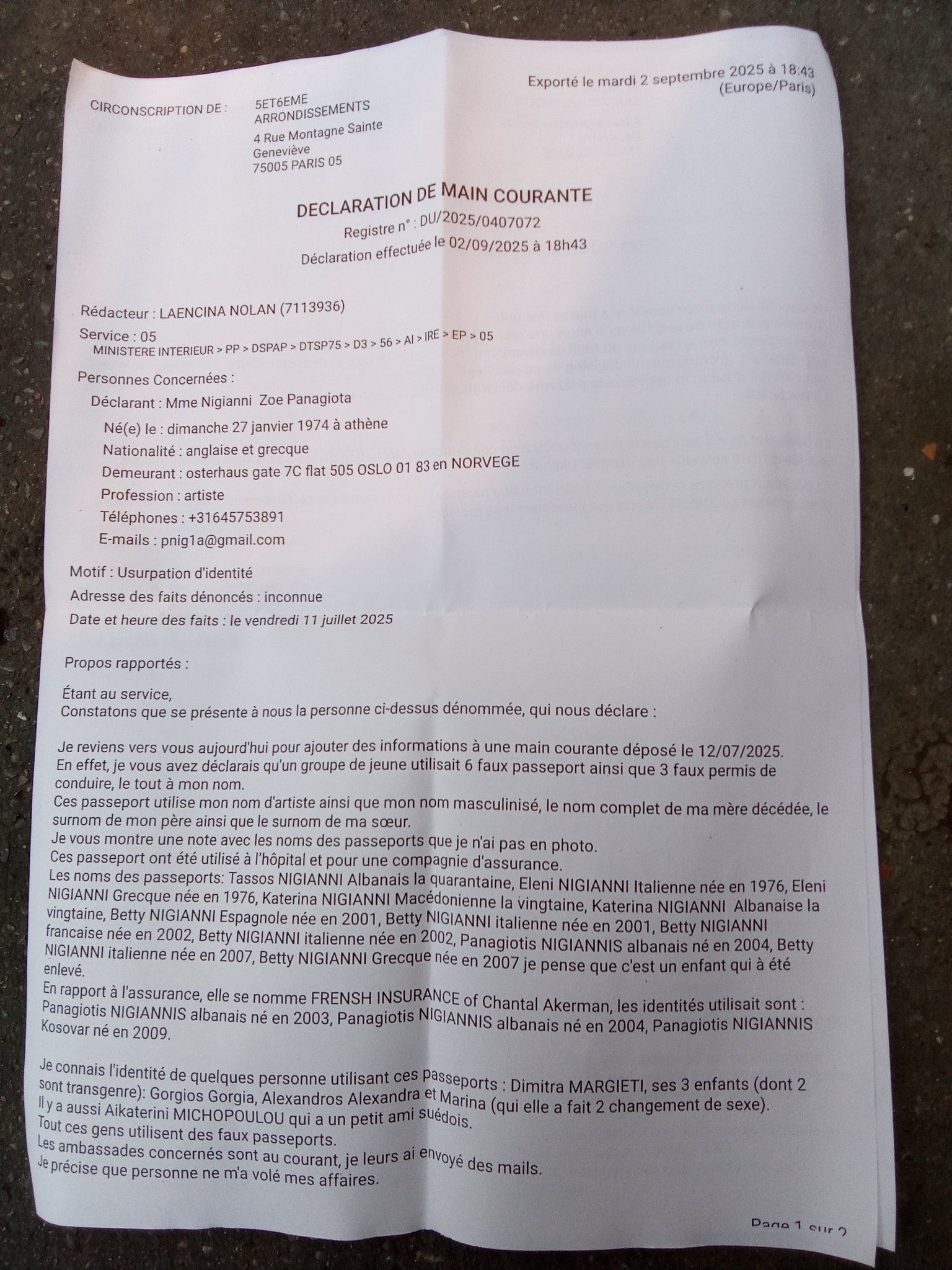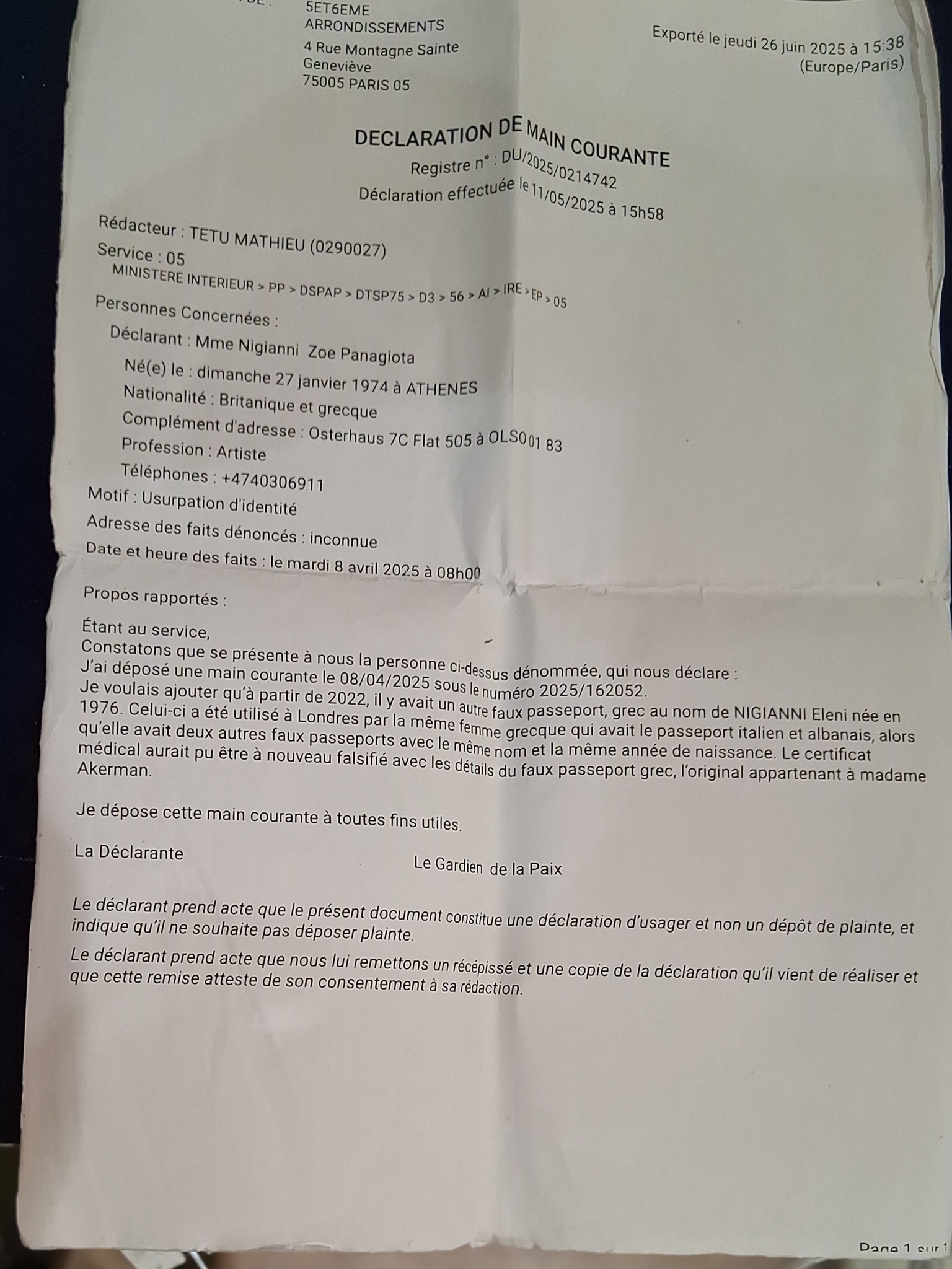 The three councils, Hackney, Camden and Haringey, where the insurance fraud was found, hired lawyers in the autumn of 2023 for their defense: Hackney still has one, but a member of staff in connection with the insurance has been recently dismissed; Hackney has now withdrawn from financing the falsified insurance: Haringey has done this, as well, and Camden is the last one, PENDING, September 2025; it went back to Hackney (I believe this is because of an intentional police mistake in Paris, 5 and 6 arrondisement, where the last police report was filed and is in their digital system; 18 police arrondisement made the additional entry by hand and stamped the entry, however it is affecting the insurance fraud in North London); the following day it was moved to Haringey again, facilitating fresh money laundering and proving the continuous plots for my assassination, now involving police officers in Paris - I don't think this is a good sign. Haringey had a lawyer, perhaps she was fired; but they have their own legal services. After Haringey, back to Camden, with Simon Harwood (aka Simon Roberson): I am not certain this is the last "ship" for the falsified insurance, because it has ended up in Hackney again, where it was first opened in 2018. Camden has used their own legal services. The local Labour MP in Haringey, Catherine West, is at fault and she has been at fault for a long time: I believe she has now resigned; as well as the local Labour MP in Camden, coming and going, Tulip Siddiq. There has been electoral fraud in Haringey council, in the local elections, 2024, when the identified Greek mother of three, Dimitra Margieti, voted with a fake Greek passport, as "Eleni Nigianni", born 1976, along with her three Greek children, who voted with fake EU passports, as: "Betty Nigianni", born 2001, Spanish; "Betty Nigianni", born 2002, Italuan, and "Betty Nigianni", born 2007, Greek. THIS IS SIMPLY HIDEOUS and NOT GOOD publicity for the Labour party. Two civil servants are potentially connected with the reported councils: David (Hackney and Haringey) and Benedicta (Hackney and Haringey); they were made redundant. Someone called "Jay" (Camden), presented at Caledonian Road Job Centre, in Islington, when it was not at full operation, in late 2023, must also be investigated for not being a member of staff; he would have been made redundant, as well. Where is the prosecution? Sadiq Khan has been the mayor of London; he needs to take charge of this, especially since his own constituency, in South London, has been afflicted by the same case, with regards to an NHS Trust, based in Khan's constituency, Tooting. Almost two years have passed since spring 2023, when I first reported the insurance fraud, and I have been harassed globally, as a whistleblower, about the aforementioned. I have no connection with any of those three North London councils, because I have never lived in any of those councils. At least Macron, one of the bravest European prime minister, has prosecuted Marine Le Pen and Sharkozy, anti-immigration, far-right politicians, for embezzlement and other. Nevertheless, not brave enough, to start with, to tackle suspected corporate fraud, with regards to the French insurance company, in connection with international organised crime and the Middle-East, as well as possibly the NRM-Sweden, and/ or the National Rally, and/or the Greek Golden Dawn: he is catching up. The French police produced a report about seven, to start with, which has been updated with follow-ups until September 2025, falsified medical documents, with different fake passports (the one for "Eleni Nigianni", born 1976, would have been forged twice, also with a fake Greek passport, because there is NO Greek citizen wth those details), and the falsified insurance in the three "Panagiotis Nigiannis" (fake name, ACRO, 2023), two Albanian, b. 2003 and b. 2004, as well as a Kosovo one, b. 2009, after I reported in person at a French police station on 8 April 2025 (see below). The address is misspelt as the French police officer heard it: in English, it reads as "the house of 'other", instead of "the house of oyster" (Oyster also being the name of the card people use in the tube in London), which is how, in my view though I don't speak Norwegian, the correct address reads in Norwegian. I thought it was telling with regards to attitudes towards race. I took the picture outside the Louvre. There is an update on that with the same police station in Paris, dated 11 May 2025, under the same reference number, about the fake Greek passport, with the fake details Eleni Nigianni, born 1976, like the Italian fake, which were used for forging a medical document for the identified Greek adult woman, called Dimitra Margieti. The number of forged medicals rose to ELEVEN (11), then fourteen (14), finalising at FIFTEEN (15), because medicals were also forged three times for the three teens, plus one more, who is not their sibling, but the Greek/Swiss woman's sibling, who had a fake French passport as "Betty", born in 2005. For the identified Greek mother of three and the Greek/Swiss, medicals were forged twice, since they used TWO different FAKE passports, each one of them, to claim fraudulent benefits. Their male Scandinavian friend, with his "twin" claims appeared to be less "greedy", being content to use only one of each fake non-EU passports, North Macedonian and Albanian, but for two different claims, running at the same time; THERE ARE ONLY TWO FAKE ALBANIAN PASSPORTS with the FAKE DETAILS "Tassos Nigiannis", born in the 1970s, with different dates of birth, because there are no twin brothers.
