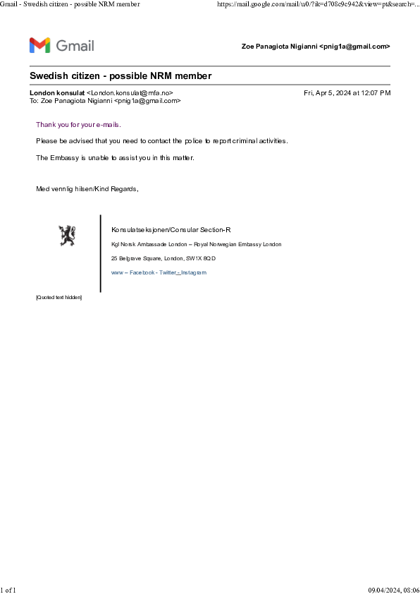 1. I didn't have a person number in Norway, when I went there as a single person; I hadn't lived there before. I went as political asylum seeker on 29 March 2024, fleeing from the United Kingdom, on a Norwegian Airlines flight, with my British passport, Zoe Panagiota Nigianni, as shown on the boarding pass above; to seek asylum from Greece that had released from prison prematurely Golden Dawn's leader, Nikolaos Michaloliakos, and some of the top members, as well as the UK, where Golden Dawn has committed serious organised crime against myself. In Norway, border police give a DUF number to asylum seekers, after they take the passport they entered the country with, in my case my current British passport (I also gave them the cut, hard copy of my old UK/EU British passport in my legal name at birth, Panagiota Nigianni), and they process them: meaning taking their biometric data, such as fingerprints and mugshots, shared in the Schengen area and within the Dublin regulation countries, including the UK, while noting their countries of citizenship they seek asylum from, by use of the passport they entered the country they seek political asylum, on the DUF they produced: in my case, the UK (British passport) and Greece (country of origin), who have abused my human rights as a citizen of both of those countries, due to the international, interconnected fraud. They checked that I don't have any criminal records: they don't place people with criminal records in asylum seekers' facilities. In fact, I have had developed vetting and the Norwegian authorities were aware of this. This was unprecedented in history and it happened under Store's Labour government, to place in political asylum facilities a person, who has been criminally persecuted for their left-wing ideology. It's a separate process to apply for a person number, which is basically a tax number, through the tax office, for asylum seekers, as well. I applied on 22 April and went to an appointment for that on 8 May. I was brought back to London unexpectedly and without reasonable explanation on 22 May, physically assaulted, again for no reason, by two unofficials, a man and a woman: twisting my arm while I was pressed against the wall, making me sit on a chair with handcuffs, then walking barefoot to a van (since I wasn't putting on my pink shoes that are made for snow, as they insisted, and they wouldn't give me any other of my shoes to wear), putting the seatbelt tightly on top of my handcuffed wrists, so it's painful and I get bruised. That is called abuse of a protected person, which has happened, illegally, by far-right officers in other European countries, against political asylum seekers. Three more joined them at the end of the drive, however those didn't use physical force. Their excuse was wrongfully guessing I had children, which they popped-out when we were on the plane: specifically, a daughter with the former Greek prime minister, Loukas Papadimos, the centre-right coalition prime minister, who was also financial advisor of George Papandreou, Greek prime minister prior to Papadimos. Or, although this wasn't mentioned, a 17 and an 18 year old, actual current ages of 21 and 22, in 2025, supposedly born 2004 and 2003, or 23 and 24, in 2025, supposedly born 2002 and 2001, respectively, on fake non-passports and fake DLs, given by the traffickers, presenting themselves as YOUNG ADULTS, because children in the UK are considered those -17 years old, and from 11 until 17, they are seen as teenagers, whose parent, though is responsible for them until they reach the age of 17 - whose mother is an identified Greek citizen. Their mother is neither myself, nor someone I personally know; the same mother of the aforementioned girl, as well as another baby's she had in the summer of 2023: four children in total. However, even if I had children, or so they had thought, why would they do that (rhetorical question, because it was for twisted politics of some sort)? The Papadimos' hypothesis had been previously dismissed in May by the Swedish authorities and was later also dismissed by the Greek police. Unfortunately, his daughter had, amongst other, a fake Kosovo passport as a boy (currently 16 years old), after illegal gender modification surgery in the UK - who is responsible for this? - and later reversal, I suspect in Greece; and three more fake passports: a North Macedonian, an Albanian and an Italian as Albanian citizen. She also has three police files with the Met, dated 2023 most likely, put down with a fake Italian DL, as Italian and Albanian. Children seeking asylum with parents are processed the same way as adults by border police. No children were processed with myself, because I don't have any. About a week before the incident, I had noticed a group of men, all dressed in black, with black caps, like NRM members do, fishing in the nearby to the asylum seekers' facilities river. The Greek police dismissed all claims about children of mine, again in September 2024, as false. This has also been clarified in autumn 2024 with the Norwegian authorities. However, once they take you out of the facilities, they don't take you back in, confirmed by a border police officer at Oslo airport last September; which means the asylum seeking process is over and that's precisely what guilty parties (and not just political) wanted. Prior to that, I had left London on 23 May 2024 fearing for my life. Because it is outside of Schengen, I flew to Albania for the first time in my life, in late May 2024, once I was taken by forced back to Gatwick, and stayed there until late September, with my asylum seeker's card from Norway, as a last resort: to prove I have no connection with Albania. While I was in Albania, it soon became transparent that it has been an international criminal sham - ONGOING, April 2025. At least Michaloliakos and his friends returned to prison in June, after I went to Albania for the first time on 24 May and spoke to the immigration aut