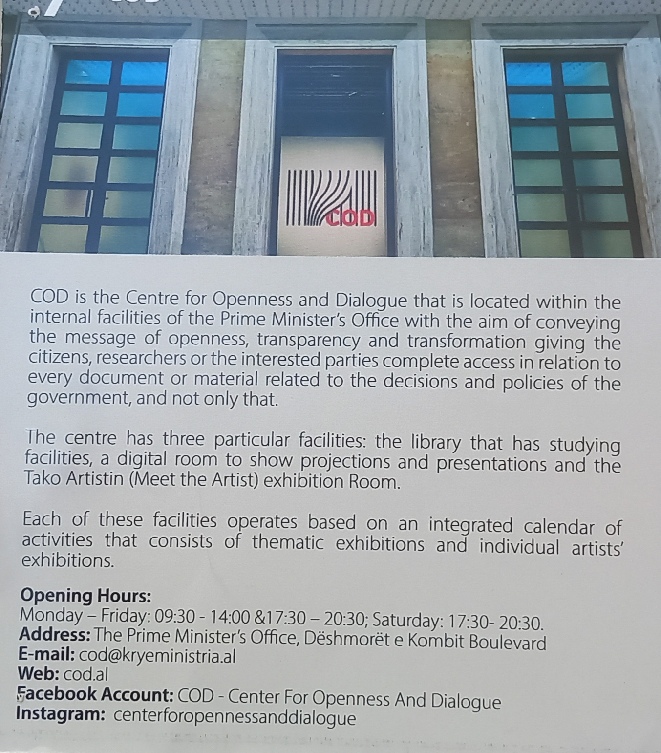 Behind the neoclassical facade, featuring contemporary designed furniture and fittings, the building that hosts the Albanian prime minister's office also hosts temporary art exhibitions, which stand alongside archives of governmenal documents.
