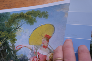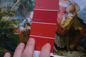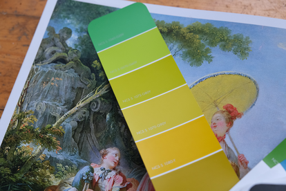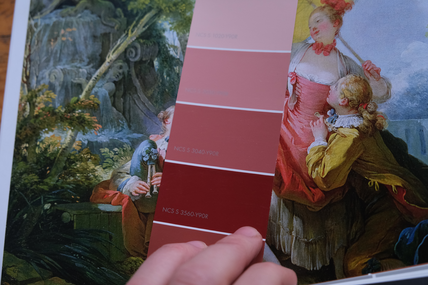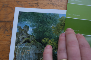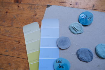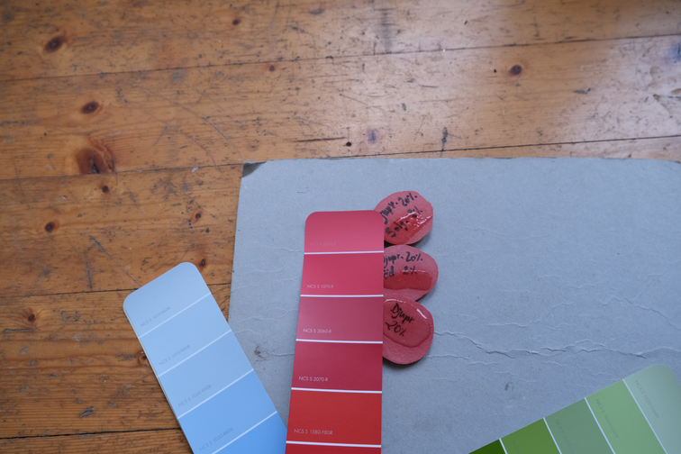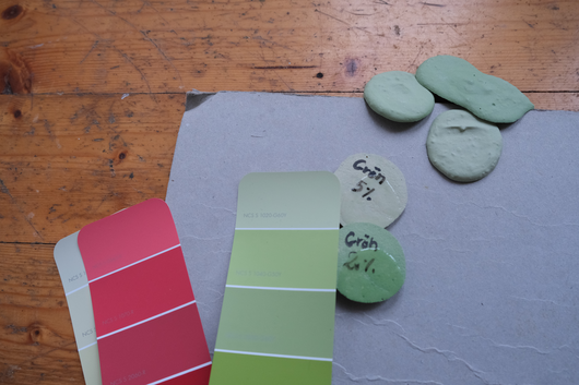 The ceramic firing process is changing the colors of the raw material. When one is mixing it, one can never expect that the end result will be the same than the original observed color. That's why I need a ceramic scheme that is already fired. Each small piece is marked with the recipe of the pigments required for making this color.