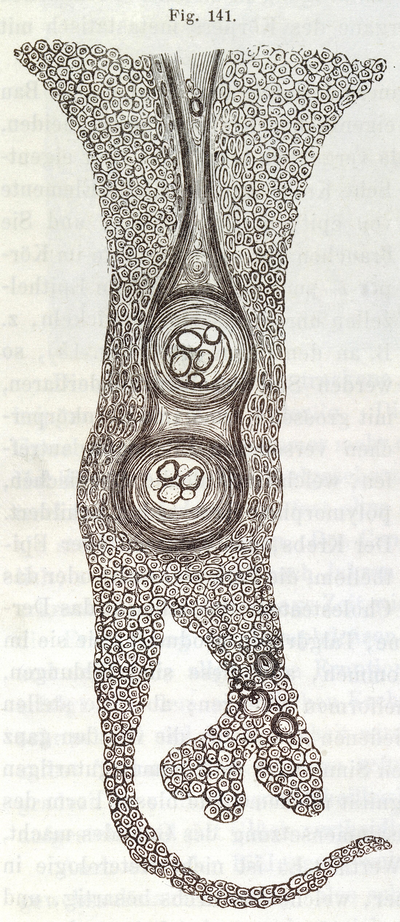 Entre os séculos XVI e XIX, a anatomia já tinha identificado e descrito grande parte da estrutura corporal humana e por isso abria a possibilidade de se explorarem outras subdivisões, entre as quais se destaca a anatomia patológica que se debruçava no estudo do cadáver sob o ponto de vista clínico. A necessidade de compreender as alterações provocadas pela doença, aliada à descoberta do microscópio, permitia aprofundar o conhecimento da biologia aplicado à medicina. Neste contexto, Rudolf Carl Virchow (1821-1902) enceta um conjunto de descobertas no campo da patologia celular na tentativa de descortinar qual a origem das alterações provocadas por algumas de algumas doenças caractisticas da altura como o raquitismo. Uma das obras que publicou Die Cellularpathologie defendia a tese de que as doenças são baseadas em distúrbios encontrados nas células do corpo. Para ilustrar sua a teoria, apresentam-se um conjunto de desenhos onde se identificam as alterações celulares que caracterizam a presença da doença.