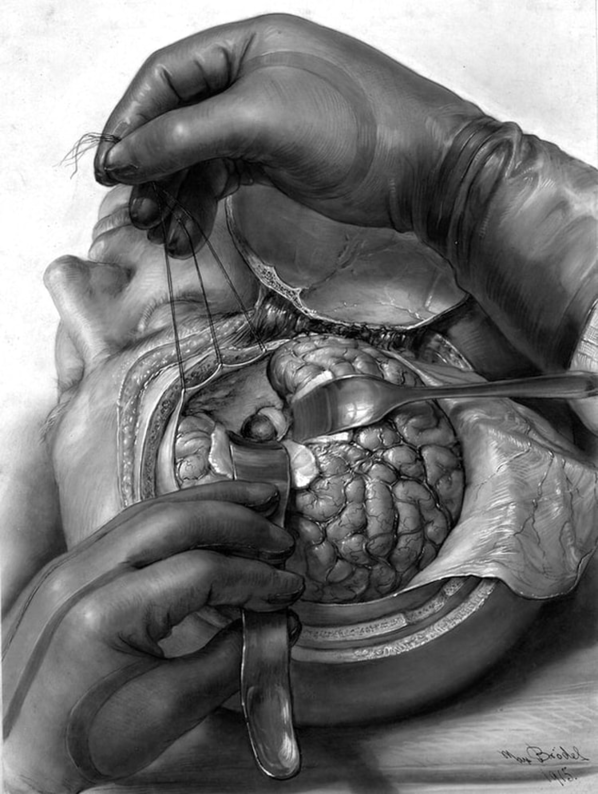 Max Brödel (1870 – 1941) evidencia-se como uma figura proeminente no desenvolvimento da ilustração médica, principalmente no campo da cirurgia. Procurou conjugar a sua habilidade artística com a aquisição de conhecimentos na área da Medicina através do contacto com alguns médicos no hospital Johns Hopkins, local onde trabalhou enquanto ilustrador e no qual acabou por fundar a primeira escola de ilustração médica. Os seus desenhos documentam alguns procedimentos na área da neurocirurgia (figura 3) e são extraordinários porque introduzem a perspetiva aérea como uma estratégia de visualização das estruturas anatómicas do ponto de vista do cirurgião. Desenhados com grande rigor, estas imagens incorporam magistralmente o realismo dos tecidos com a anatomia transversal, aliando o conhecimento transposto na imagem e a precisão topográfica. (Patel et al., 2011)