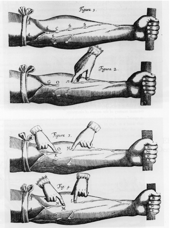 William Harvey (1578 - 1657), que se propôs a rever alguns aspectos do galenismo que permaneceram inalterados. Atentando à fisiologia galénica, esta compreendia a existência de dois sistemas circulatórios: um vincu- lado ao fígado que produzia sangue – fornecendo alimento através das veias, e outro, no qual o coração provocava uma combustão entre o ar que vinha dos pulmões e o sangue – que depois circulava nas artérias. Perante esta duplicidade, Harvey baseia-se na teoria aristotélica e prevê um sistema único através do qual o coração funciona como uma bomba que faz circular o sangue por todo o corpo. Para demonstrar a sua teoria o médico recorreu a uma experiência simples documentada através do desenho. Analisando a figura de cima para baixo, encontra-se a ilustração de um braço com um garrote, cuja mão permanece agarrada a um objecto tubular. A repetição deste elemento, numerado de um a quatro, enfatiza o número de figuras necessárias à explicação da circulação do sangue nas veias. Em auxílio deste exercício, as mãos vão pressionando os vasos sanguíneos com o objectivo de precisar a deslocação do fluído da esquerda para a direita.