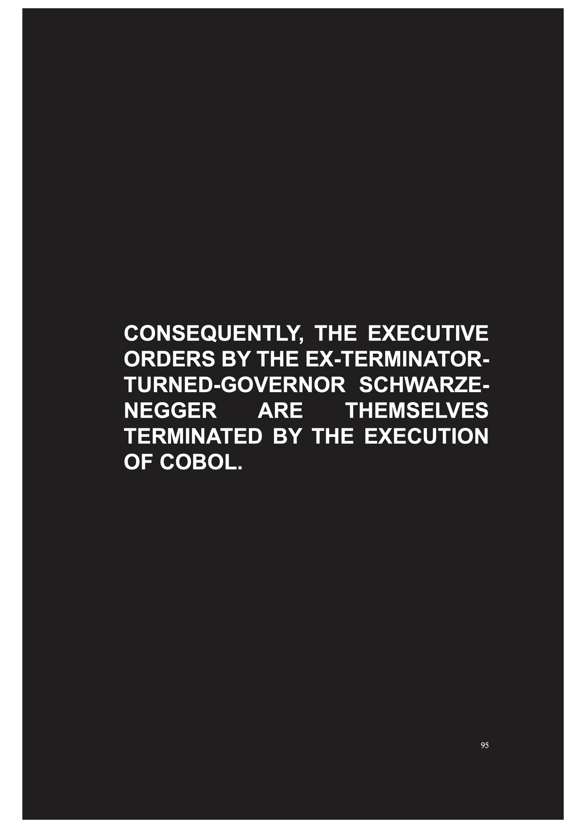 execution is commonly defined as an act carrying into effect, it also brings associations of death, of punishment, killings in accordance with the law and is regarded essential to power and command. and code has often been regarded as manifesting such power, as performative speech act --- but Schwarzenegger's trouble with COBOL implies that code and commanding is actually not doing what it says.....