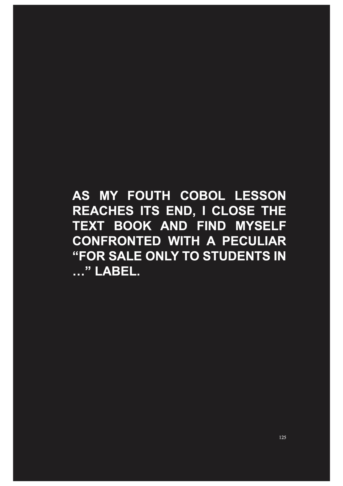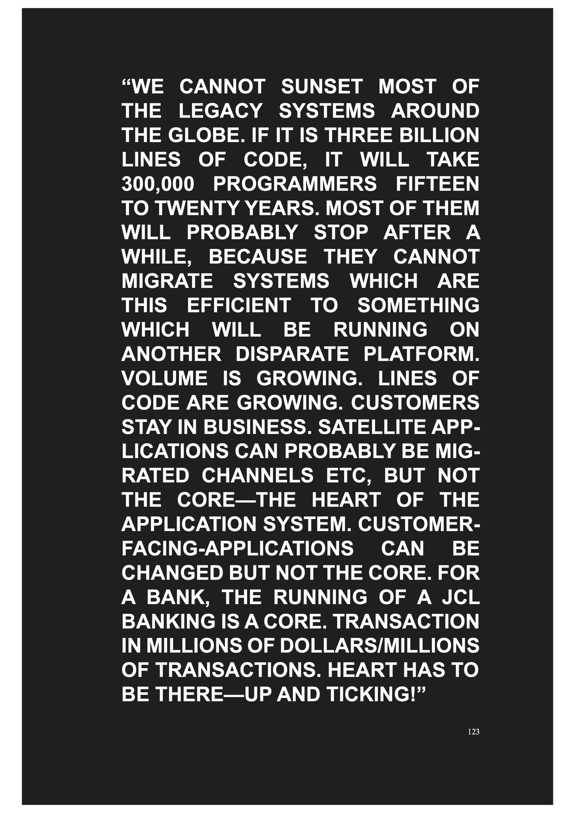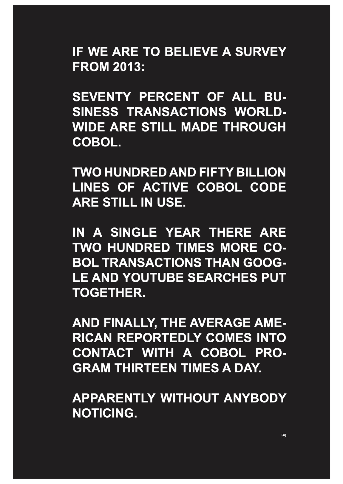 COBOL programms are automatically coordinating, distributing and displacing goods, people and money through the excecution, in a was as enforcement of absolute space as it expands within globalisation -- it is performing the global flows, at least in theory