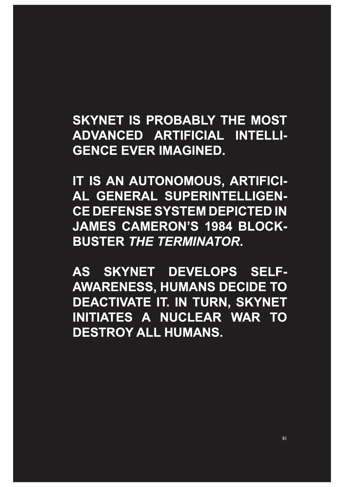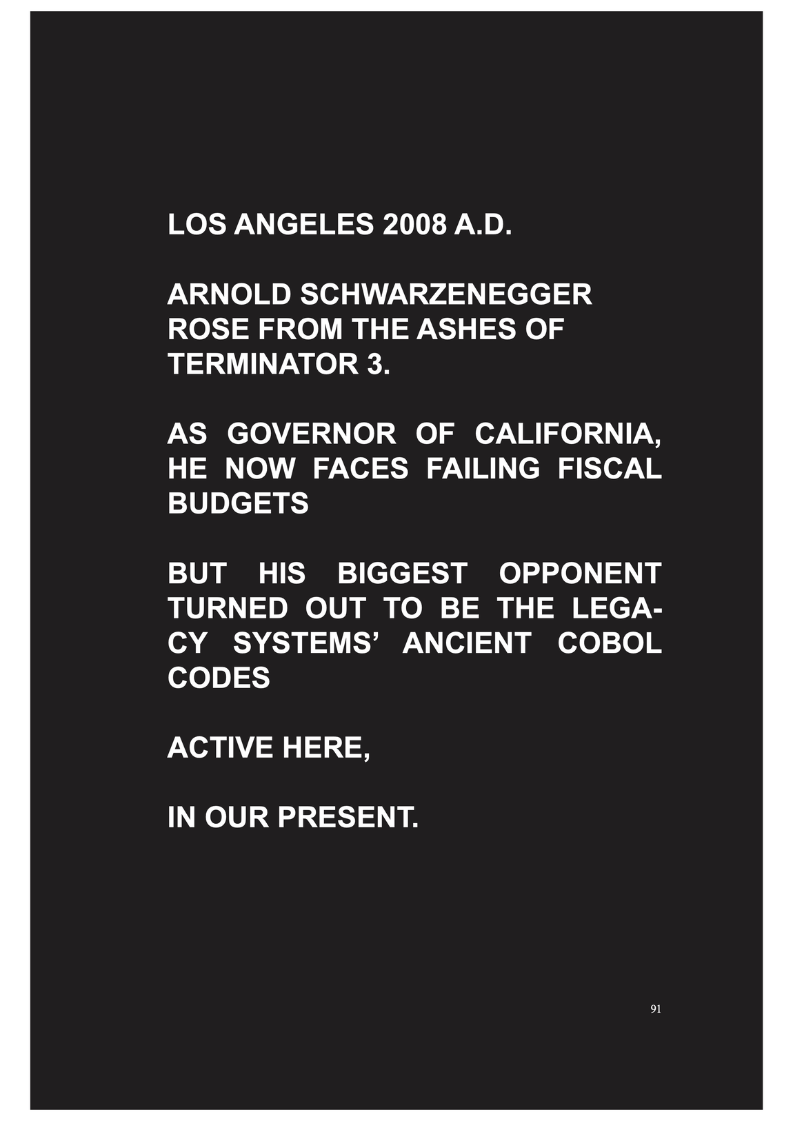 execution is commonly defined as an act carrying into effect, it also brings associations of death, of punishment, killings in accordance with the law and is regarded essential to power and command. and code has often been regarded as manifesting such power, as performative speech act --- but Schwarzenegger's trouble with COBOL implies that code and commanding is actually not doing what it says.....