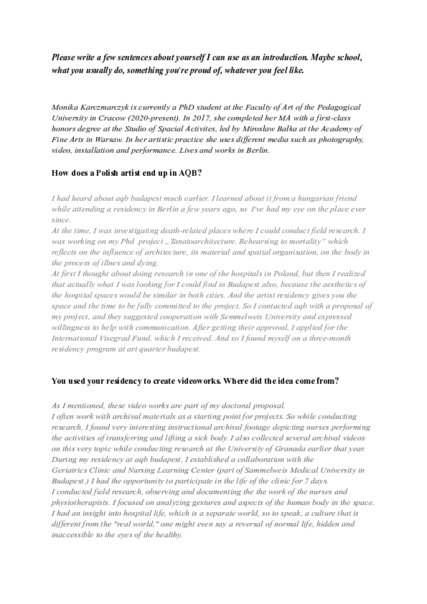 During my residency at aqb budapest, I established a collaboration with the Geriatrics Clinic and Nursing Learning Center (part of Sammelweis Medical University in Budapest.) I had the opportunity to participate in the life of the clinic for 7 days. I conducted field research, observing and documenting the work of the nurses and physiotherapists. I focused on analyzing gestures and aspects of the human body in the space.