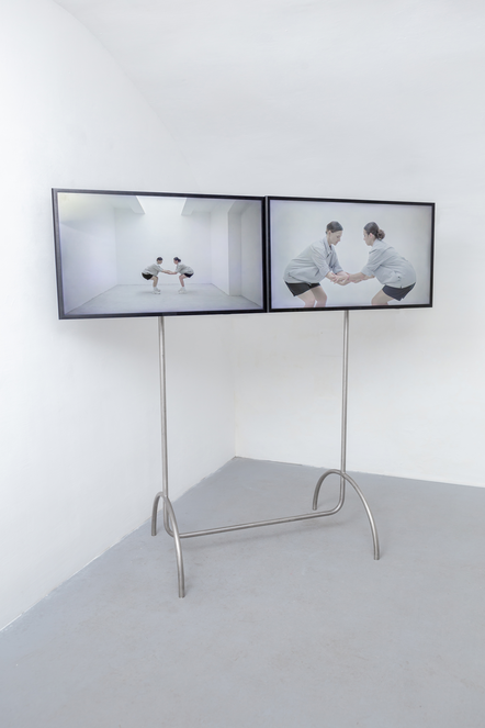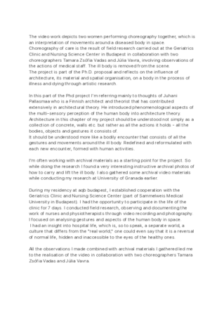 approach. For example, there was a position in which two caregivers were helping a patient to stand. One of them was belaying the other, which from an outsider perspective looked like they were forming a circle. So we focused on that adding repetition and playfulness to the position. While watching a video we are confronted with the spectacle of touch, which is usually hidden from our view, in which the main actor - the one being touched - is absent. I wanted to concentrate fully on the movements around the sick body, on touching and caring, on how care can be enacted in gestures. When you remove the body and stay with this abstract way, which when performed with calm and smooth movements can be really beautiful it starts to be more visible and strong in a way.
