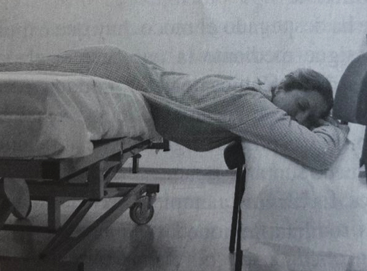 The dancers mimic the movements, but the choreography is an interpretation rather than a reconstruction of the movements around the sick body in the space. The basis is a combination of archival photos and videos, observation and documentation of the nurses’ work at the clinic, and several instructional videos found online. Together with Tamara and Julia we sort of extracted 10 components from all the materials I managed to gathered. Then from that point we built a choreography. Some positions are modified and taken further into a more playful