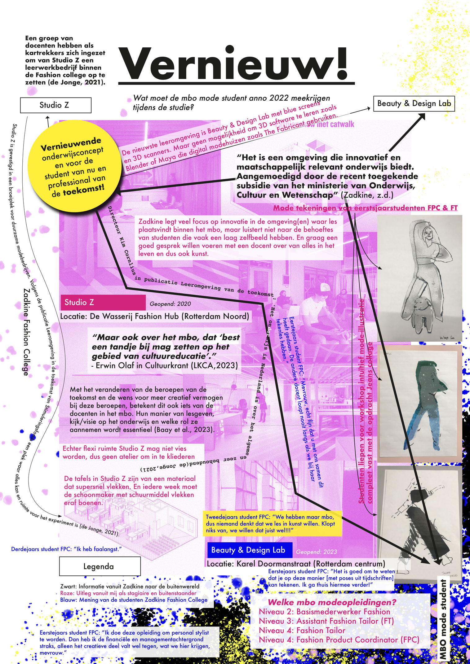 Een cartografie over de spanningsveld in mbo mode en beeldende vorming die tijdens mijn afstudeerstage van mijn docentenopleiding ervaarde. Waar aan de ene kant de onderwijsinstelling vol inzet op nieuwe en innovatieve (fysieke) leeromgevingen. En aan de andere kant studenten behoefte hebben aan de menselijke maat bij docenten en meer aandacht willen voor creatieve vakken om zich te ontplooien, te experimenteren en vorm te geven aan hun eigen verhaal.
