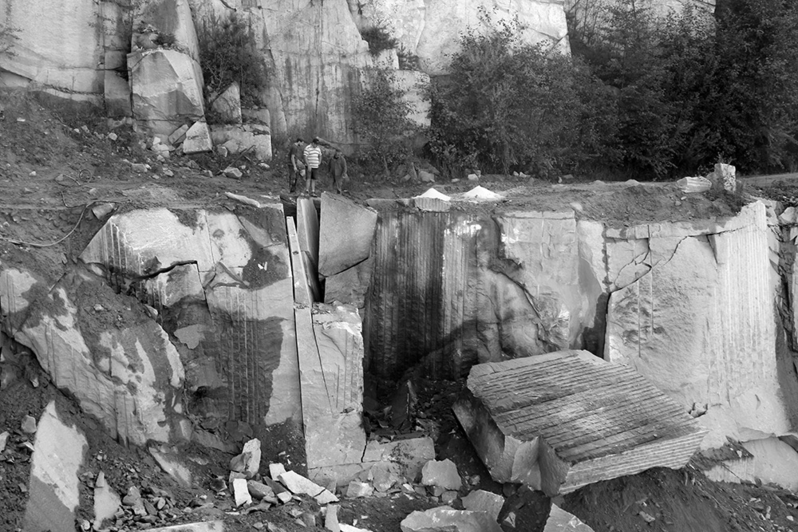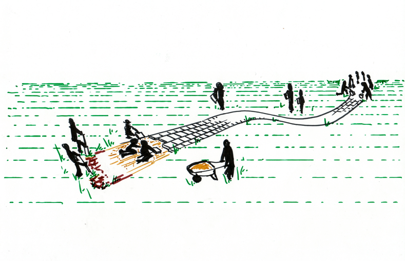The performance illustrated here depicts a setting of workers continuously building a path whilst others are removing it. Like a snake biting its own tail, the path meanders the terrain in a never-ending race of completion versus removal.