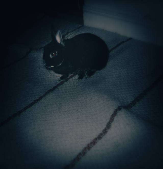 Längst framme vid scenen, i en låda, sitter en liten svart kanin.
