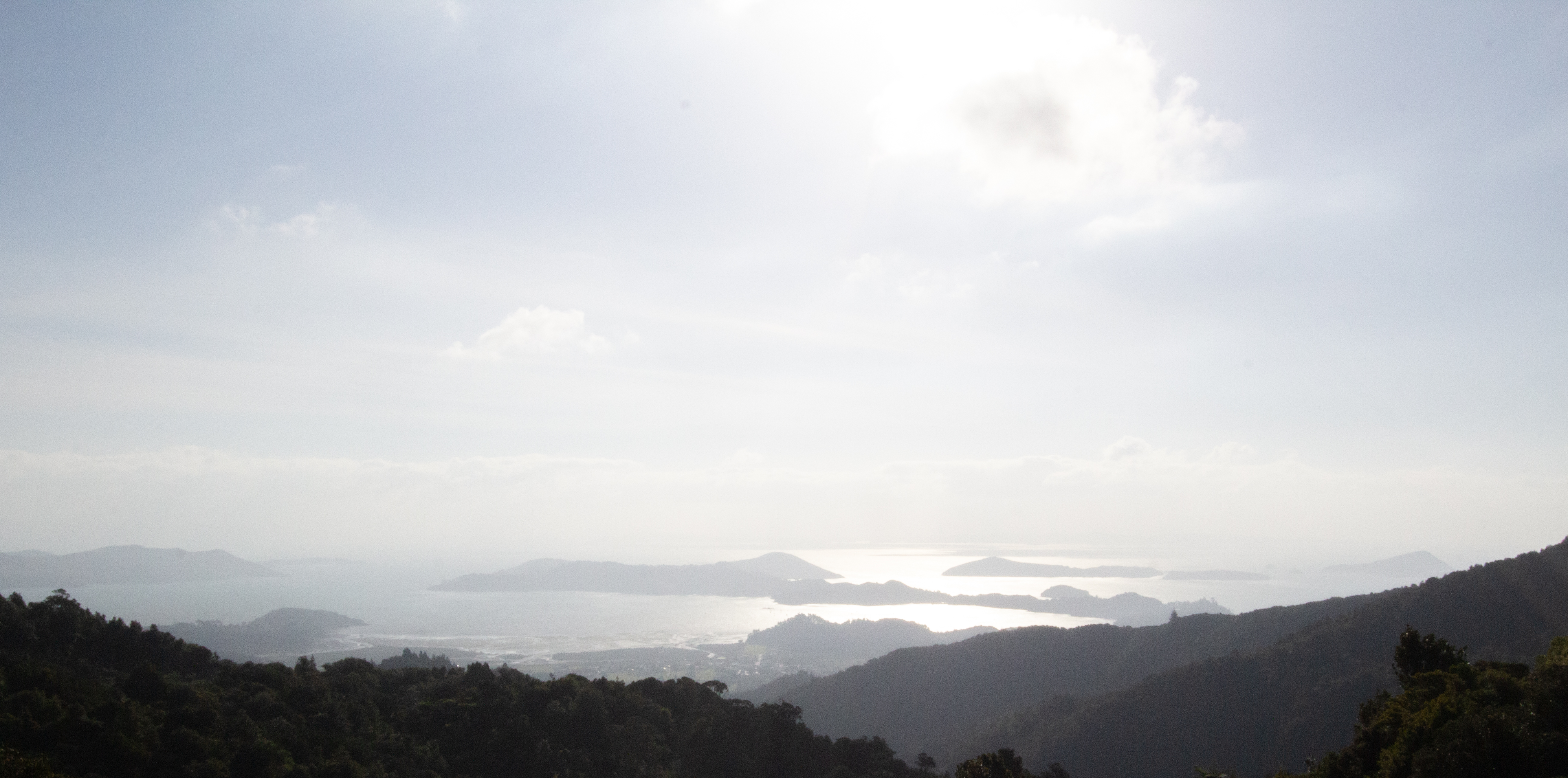 Grågrönt vatten skymtar fram genom ett disigt skimmer.