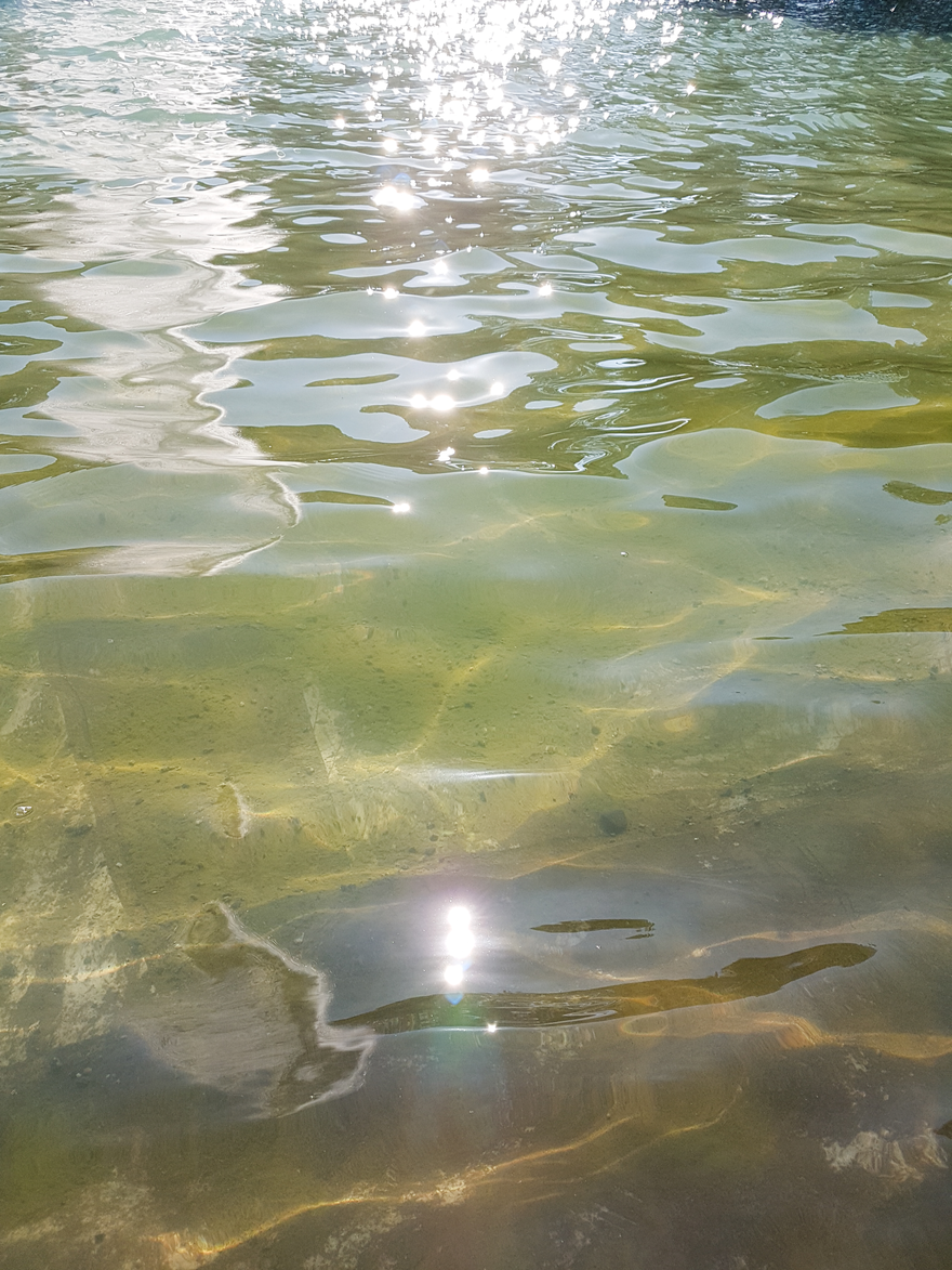 Jag går försiktigt fram på en brygga. De översta plankorna ligger precis i samma nivå som vattenytan.