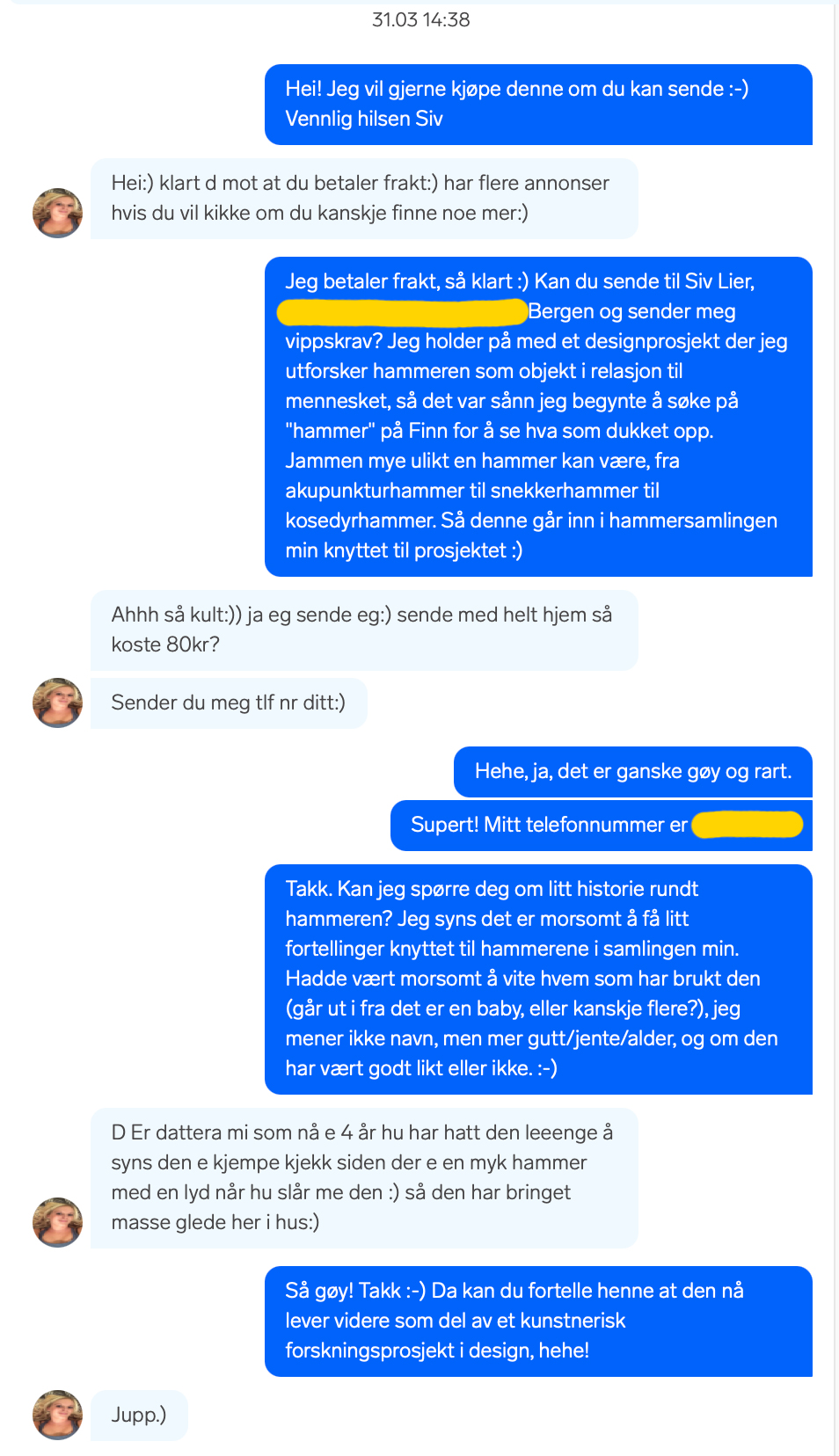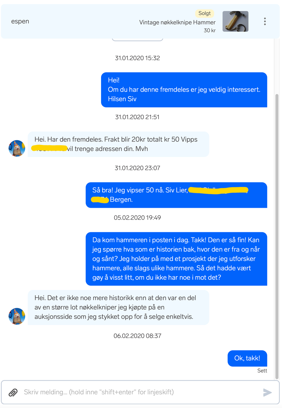 Kjæresten min har selv ikke brukt hammeren, men det kommer han kanskje til å gjøre når han får den tilbake. Kanskje han lar den komme på utstilling i heimen, for nå blir den jo berømt!