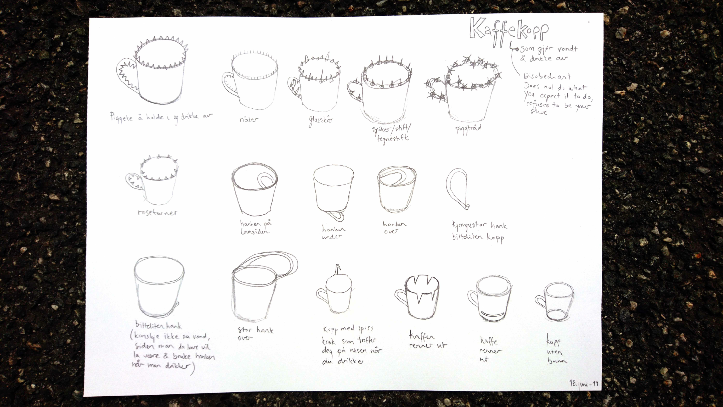 To unfold what a coffee cup doing the opposite of what I expect from it (make me able to drink my coffee in a comfortable way) might look like, I start drawing disobedient and rebellious cups; cups that hurt you when you drink from them, cups that are difficult to hold or that refuses to contain liquid. Since the handle and the edge of the cup are the most important points of contact between me and the cup, they are also the parts most important to consider in the design of disobedient cups. I started drawing cups that really hurt you, eventually moving towards drawing cups that are not directly hurtful but just uncomfortable or trying to fool you. I start with the most obvious ideas, like sharp objects on the edge and handle, and go from there.