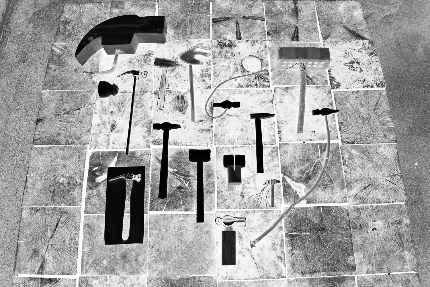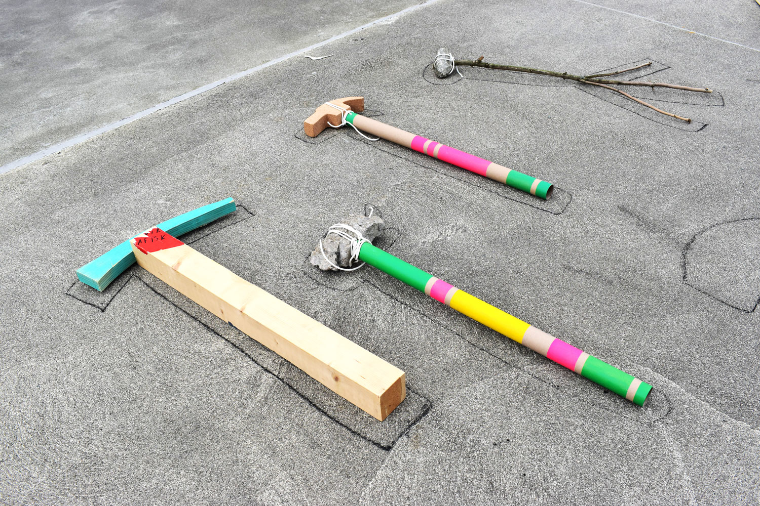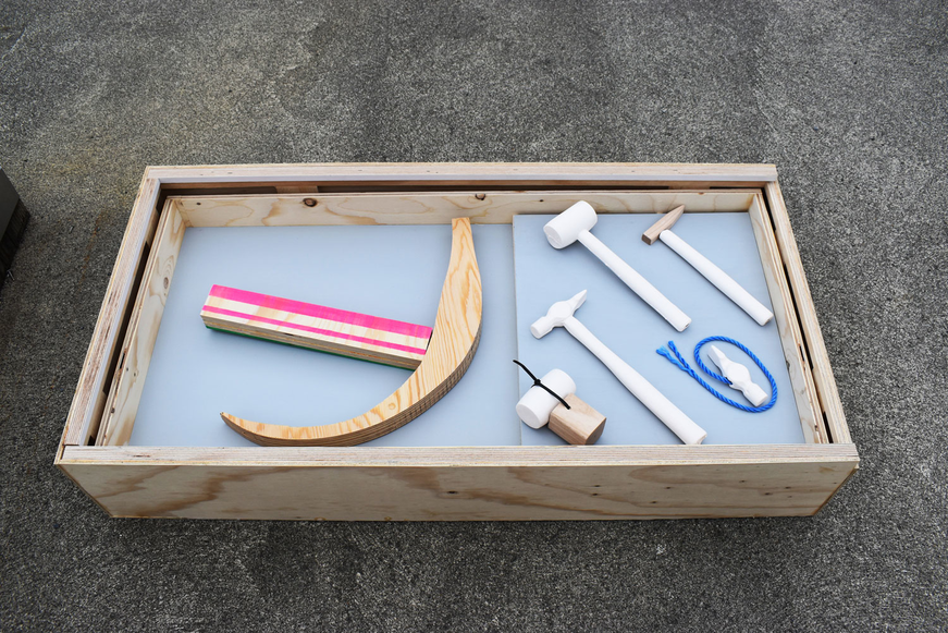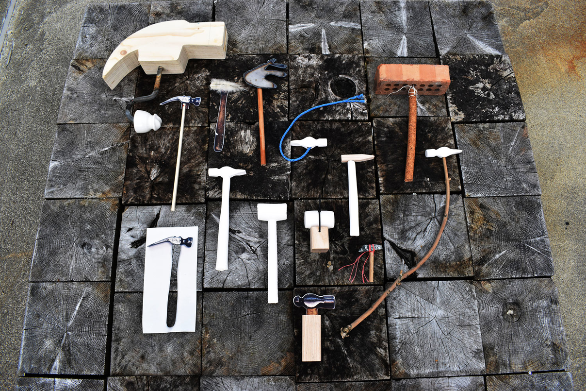 I put the biggest and most problematic hammers on top of each other. Together with Kristian, who is the master of the wood workshop, we start to talk about how fun it would be to make boxes that follow the outline of the hammers.