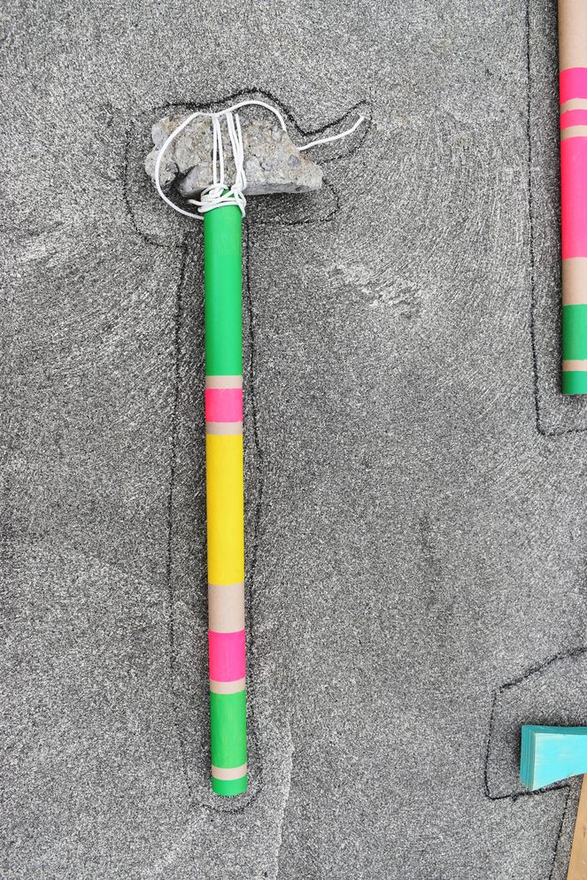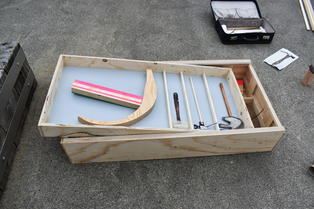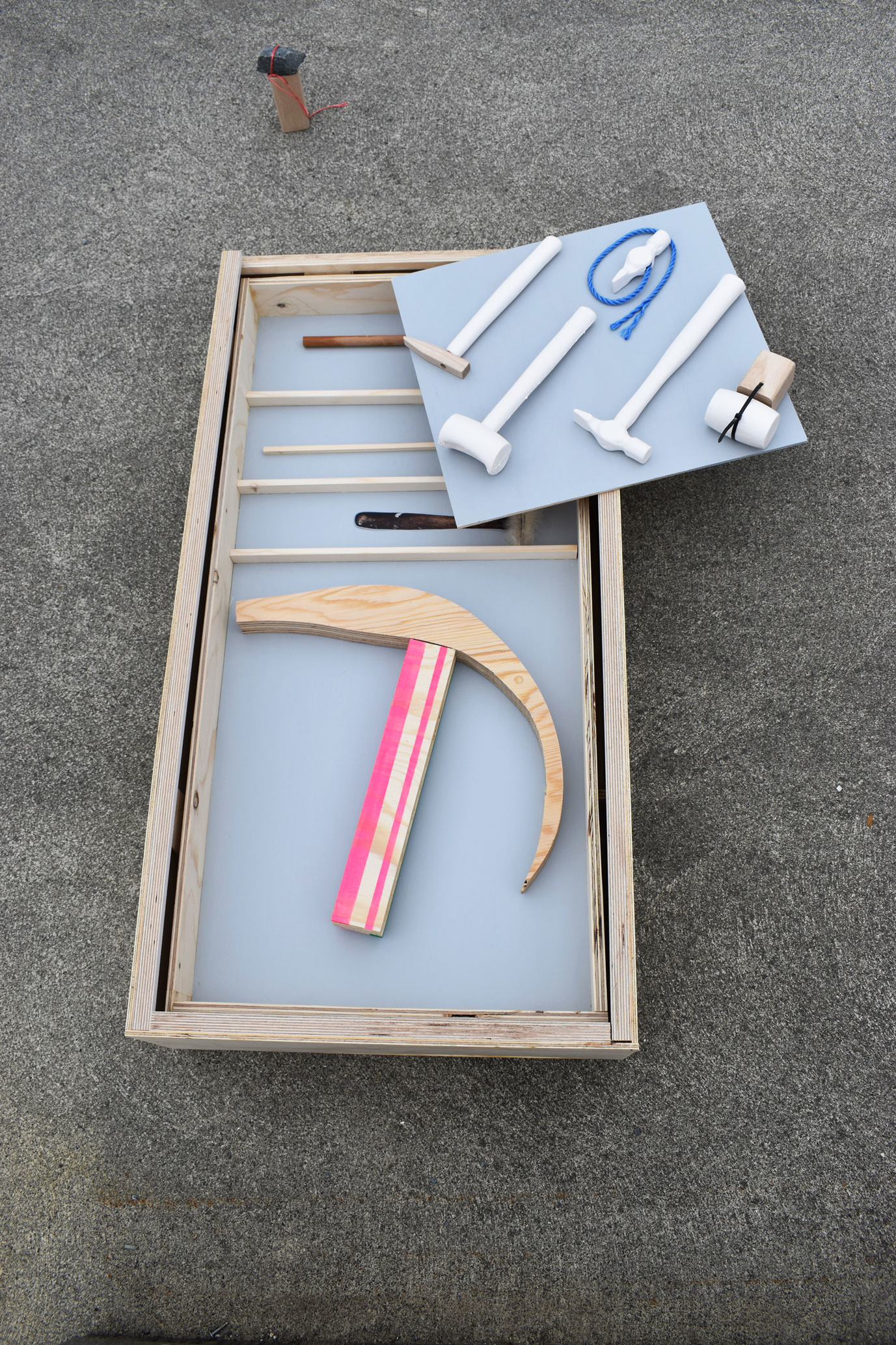 I put the biggest and most problematic hammers on top of each other. Together with Kristian, who is the master of the wood workshop, we start to talk about how fun it would be to make boxes that follow the outline of the hammers.