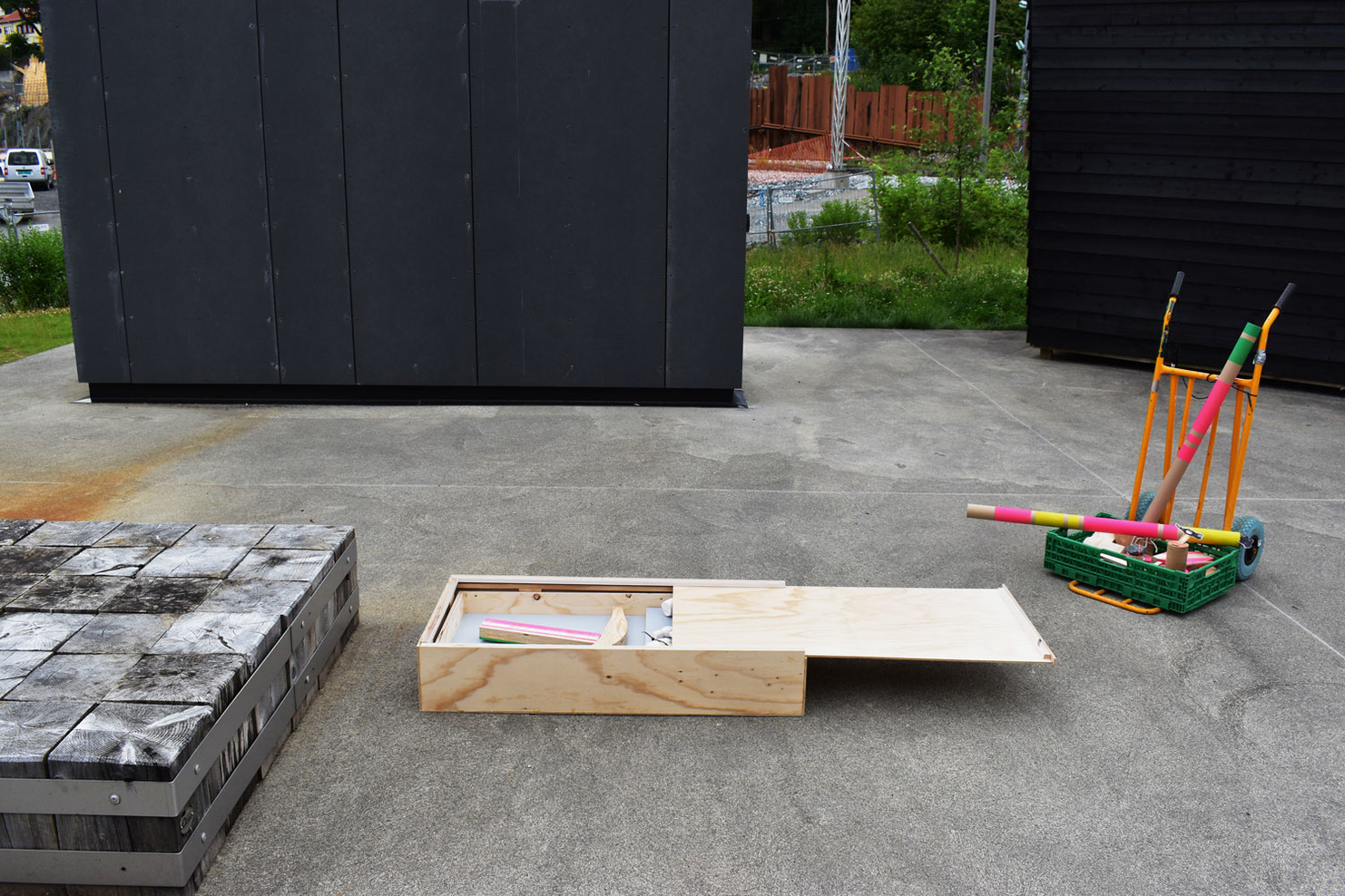 Exhibition elements, on the other hand, should provide air and space around the things that are exhibited, and be nice without drawing too much attention. Shipping boxes and exhibition elements are therefore two concepts that are difficult to reconcile, and I have come to think that what I am making now will be both poor freight boxes and ugly exhibition elements. As shipping boxes, they are too large, heavy and with low space efficiency, and as exhibit elements they are, much because I use leftover and waste materials, imprecise and not nice enough. Although using leftover and waste materials is in tune with the bricolage concept, the process has proven to cause problems; small imperfections in the materials propagate and make it all just a little bit wrong and crooked, but not enough to make it an explicit aesthetic. The result so far in the process is that both function and aesthetics end up somewhere in the middle and undefined.