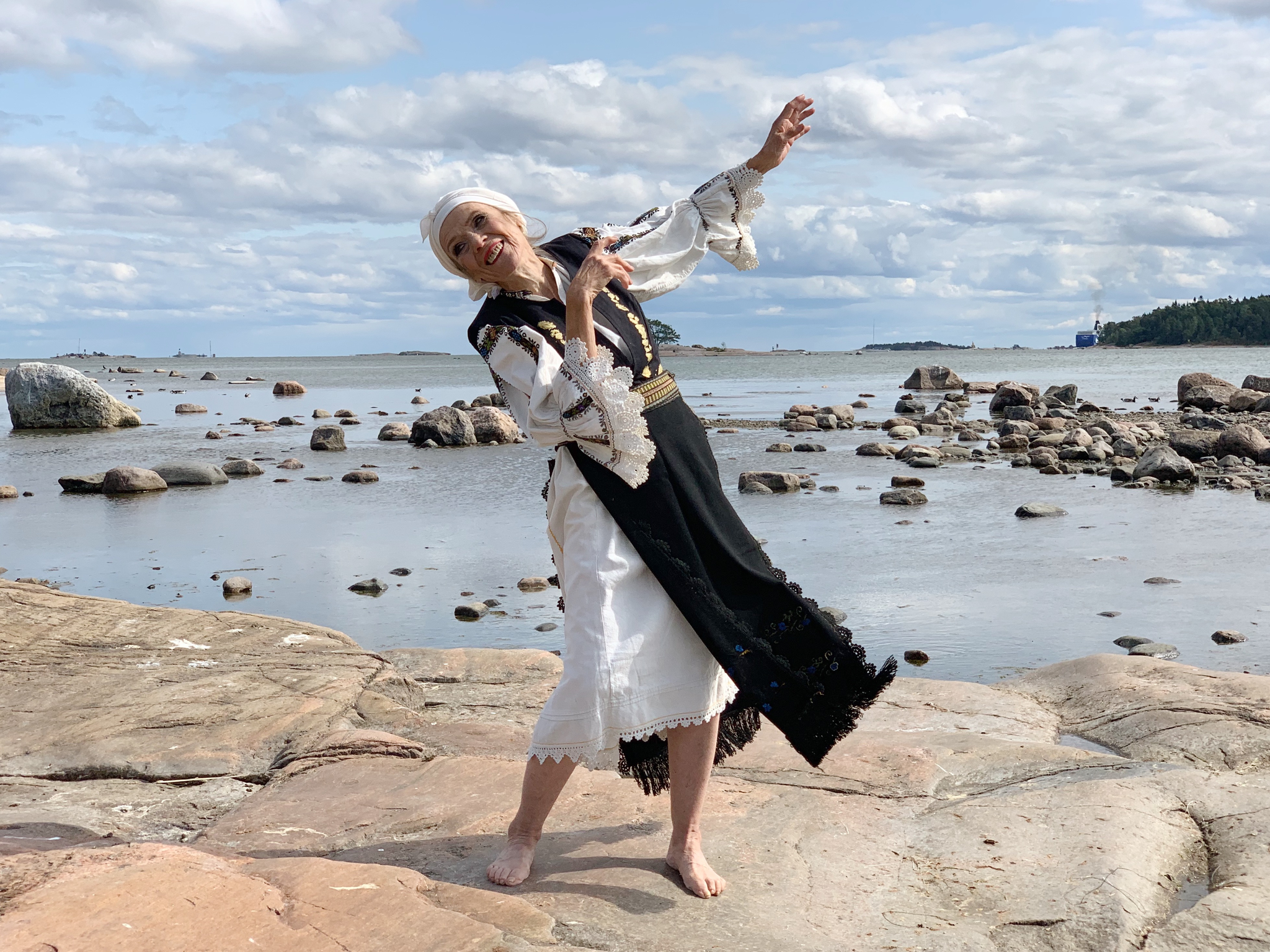 The music video for Ogrejalo slantse – Vuota vuota was filmed on a small islet in the Lauttasaari district of Helsinki. The video features five women of different ages, each playing a role in the story of the composition. The roles include a mother goddess (Ritva Kattelus), a younger woman played by me, and a dance group of nymphs (Marjo Kopra-Getov, Inkeri Sippo-Tujunen and Raija Tuukkanen), symbolising the choir in the song. In the Ogrejalo slantse – Vuota vuota music video, the Bird Crown symbolises transgenerationality and femininity. The five birds, in their role as protectors of the eggs, symbolise the continuity of life. The music video portrays a transgenerational agency in which the crowned mother goddess transfers her crown to a younger woman and, in doing so, bestows upon her the role and responsibilities of a goddess. The Bird Crown resonates with the themes of parting, transition, mourning and initiating something new.