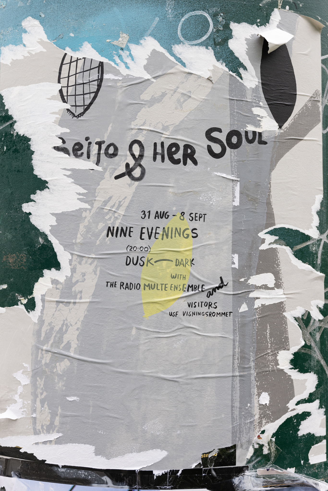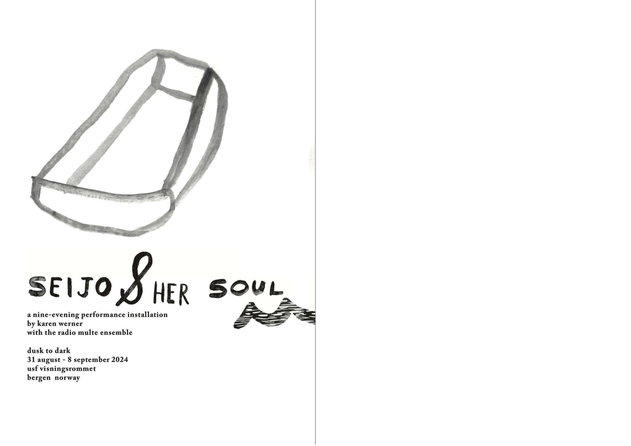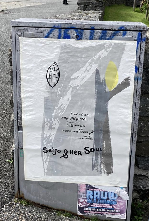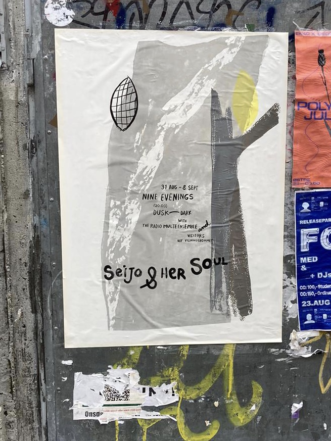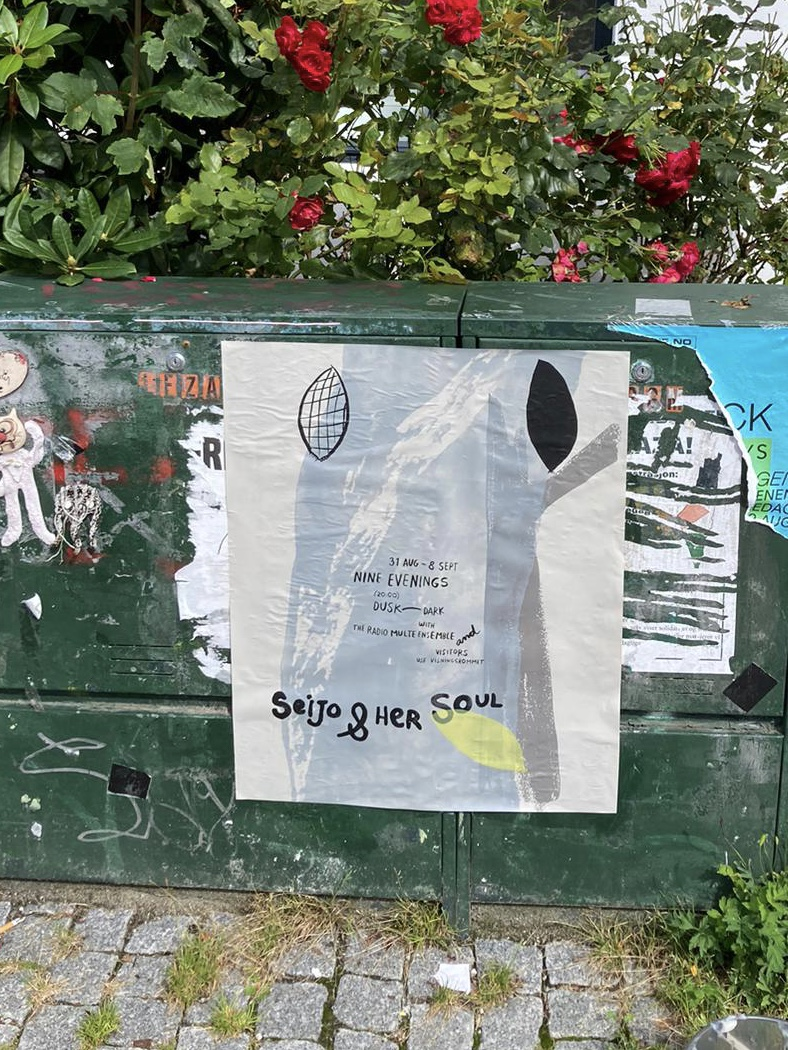 Seijo & her Soul extends into the city space with fragile paper broadcasts: hand-made wheat-pasted posters announcing the event and a zine that visitors receive when they leave, carrying the signal home. Seijo & her Soul brings together aspects of SkottegatenFM and Radio Multe: the radio station as an artistic form; qualities of radiophonic spaces; on-air conversation as co-creation; repetition and duration; relations between artist and audience and poetics of interference.