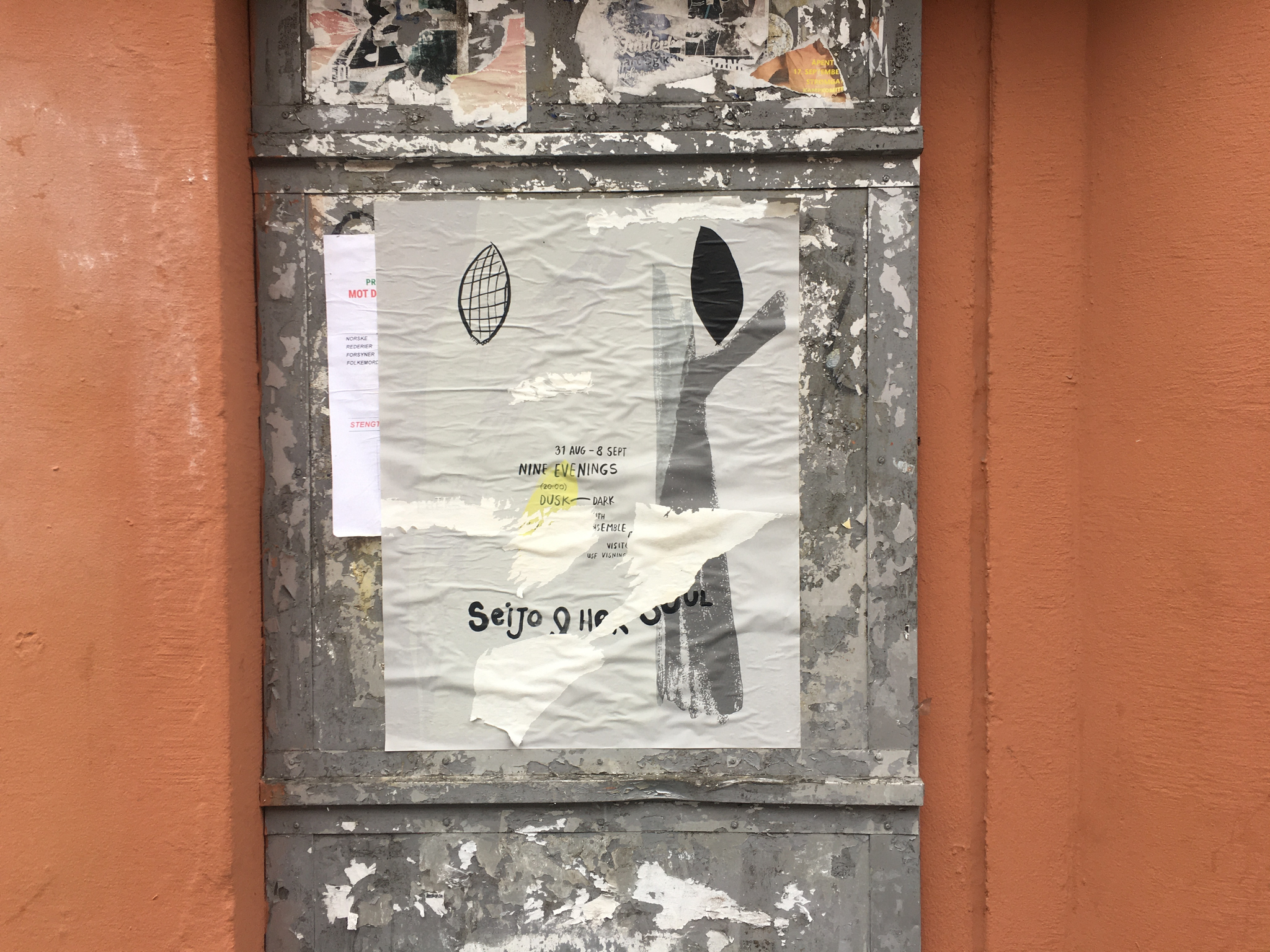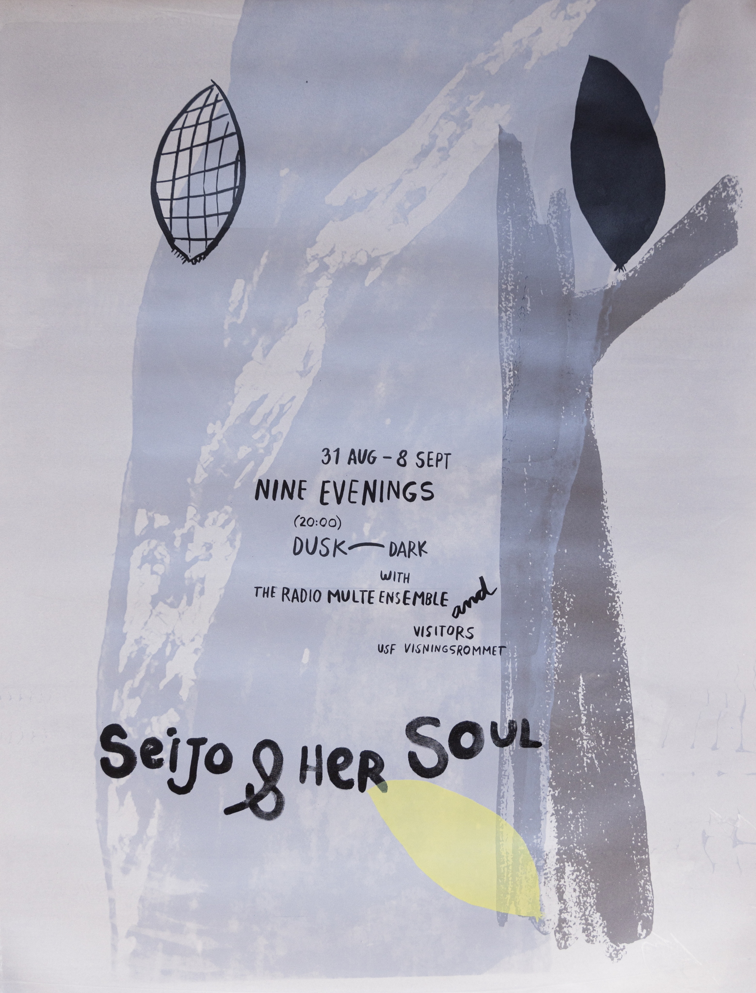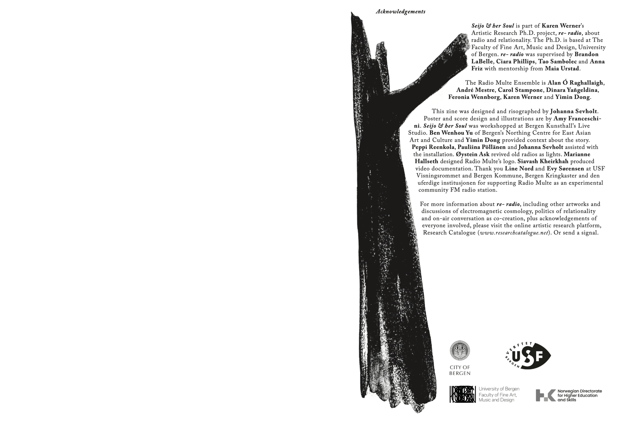 Seijo & her Soul extends into the city space with fragile paper broadcasts: hand-made wheat-pasted posters announcing the event and a zine that visitors receive when they leave, carrying the signal home. Seijo & her Soul brings together aspects of SkottegatenFM and Radio Multe: the radio station as an artistic form; qualities of radiophonic spaces; on-air conversation as co-creation; repetition and duration; relations between artist and audience and poetics of interference.