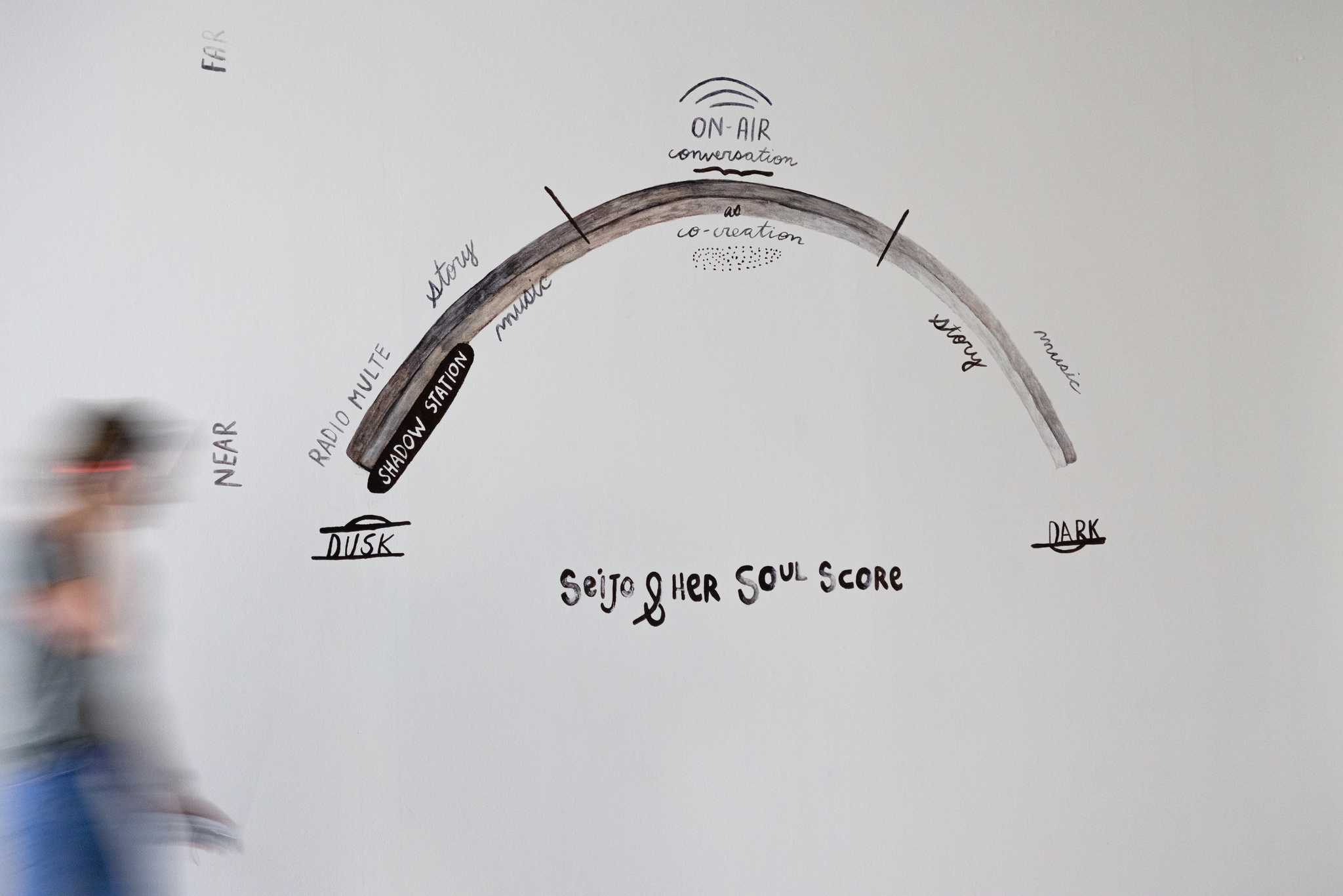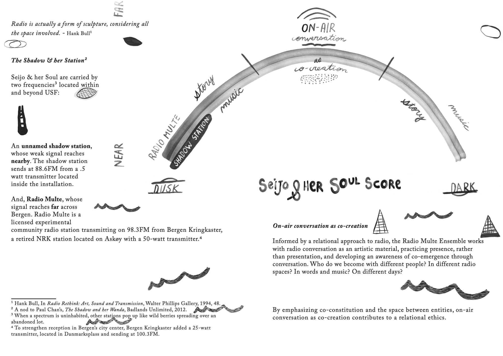 Seijo & her Soul includes two radio stations: Radio Multe sending across the city at 98.3FM and an unnamed shadow station with a weak transmitter sending at 88.6FM. The performance installation begins each evening at sunset and lasts an hour amidst the transition to darkness. Rotating members of the Radio Multe Ensemble enact a score that includes an ancient story, on-air conversation as co-creation and music, broadly defined. Visitors, who are given an FM radio, join at any point during each evening rendition: like tuning a radio, they drop in, linger, rest a while, wander.