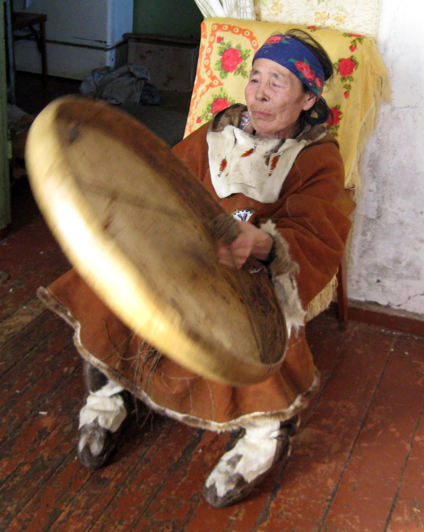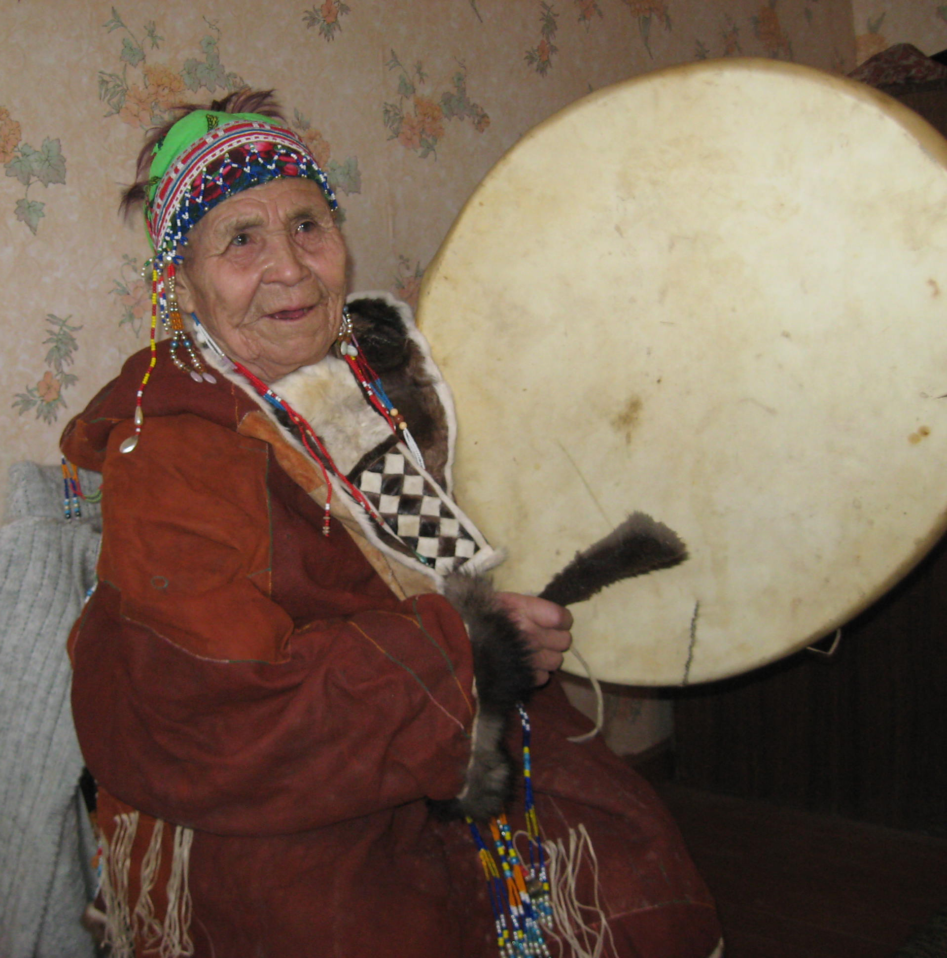 Mulingaut went out to the kitchen to prepare some food and meanwhile Ludmila sat down on the floor and began to hum a melody, as though she was trying to remember how it went. After awhile Mulingaut came back into the room. She had taken off her kukhlyanka and sat down on a stool and started to sing again, this time without a drum. While she sang, her body swayed from side to side, as if to the beat of an invisible drum. The character of the songs varied from contemplative humming to boisterous songs, that imitated animal sounds, ending with outbursts of laughter. There was no need to beg her to sing. She sang for her own pleasure. She continued much longer than I had expected and not once did she complain about being tired. She told me that she would give me one of her songs as a present.