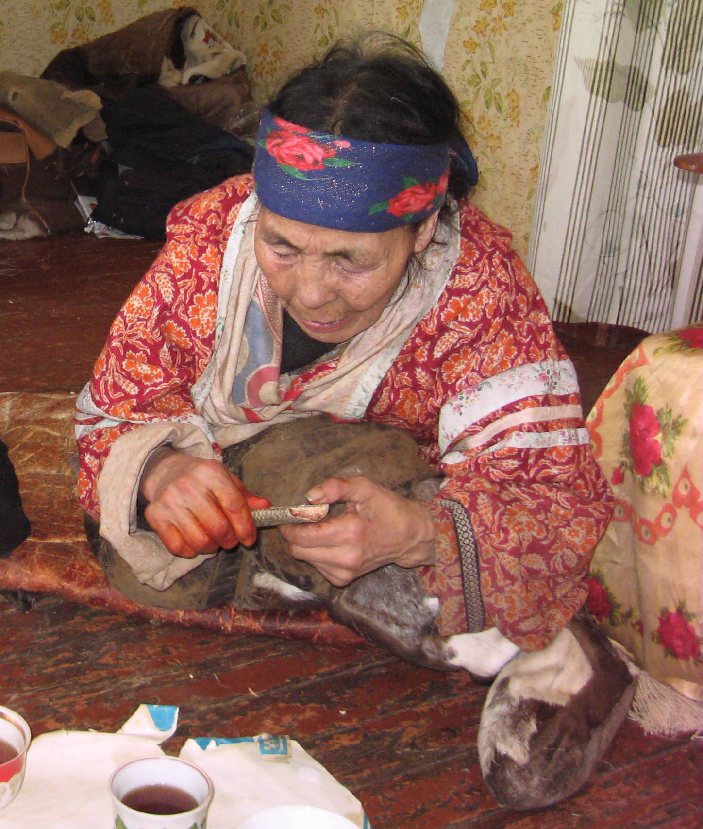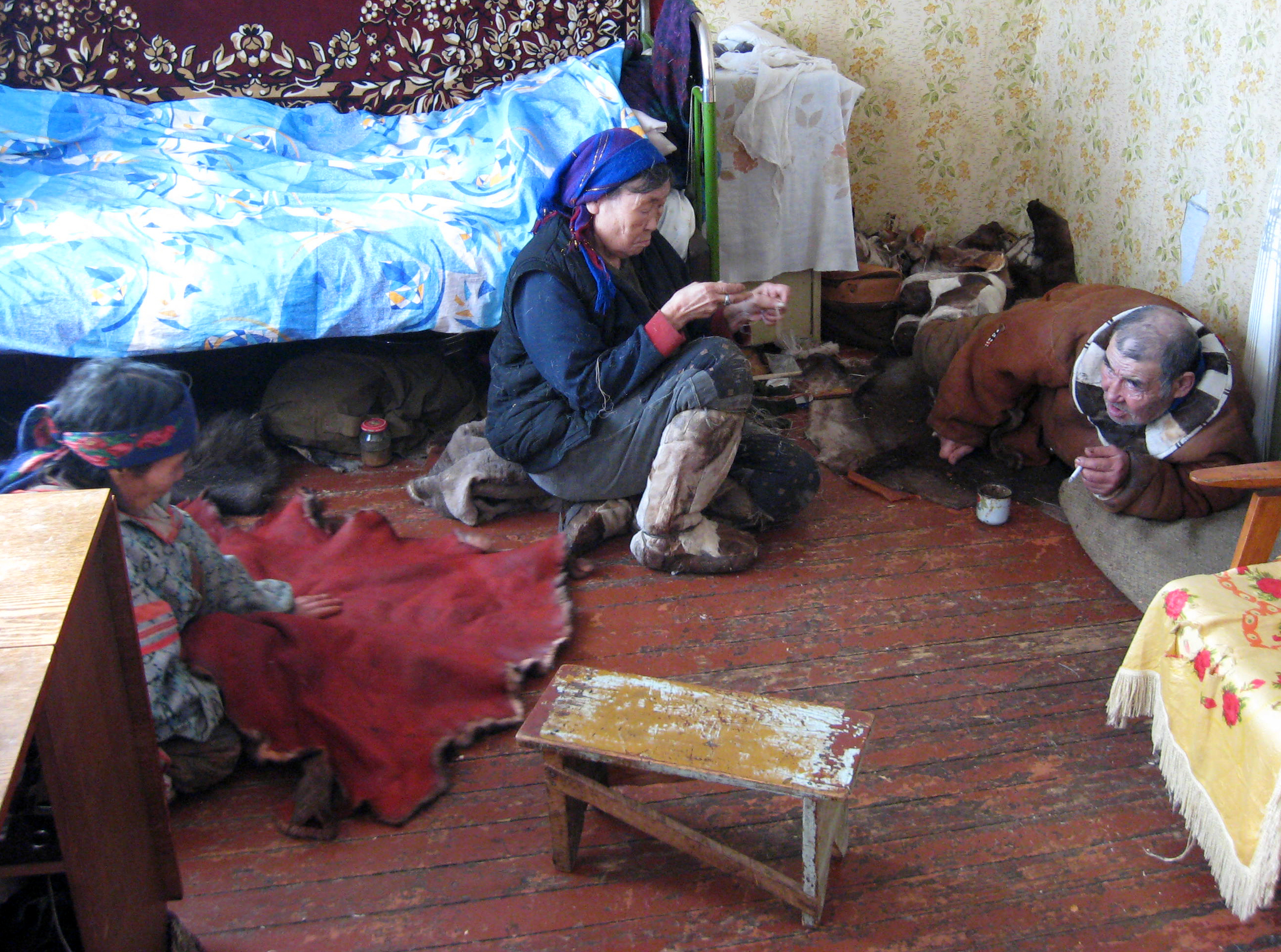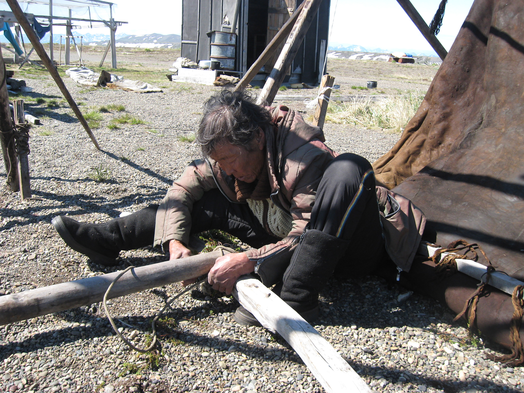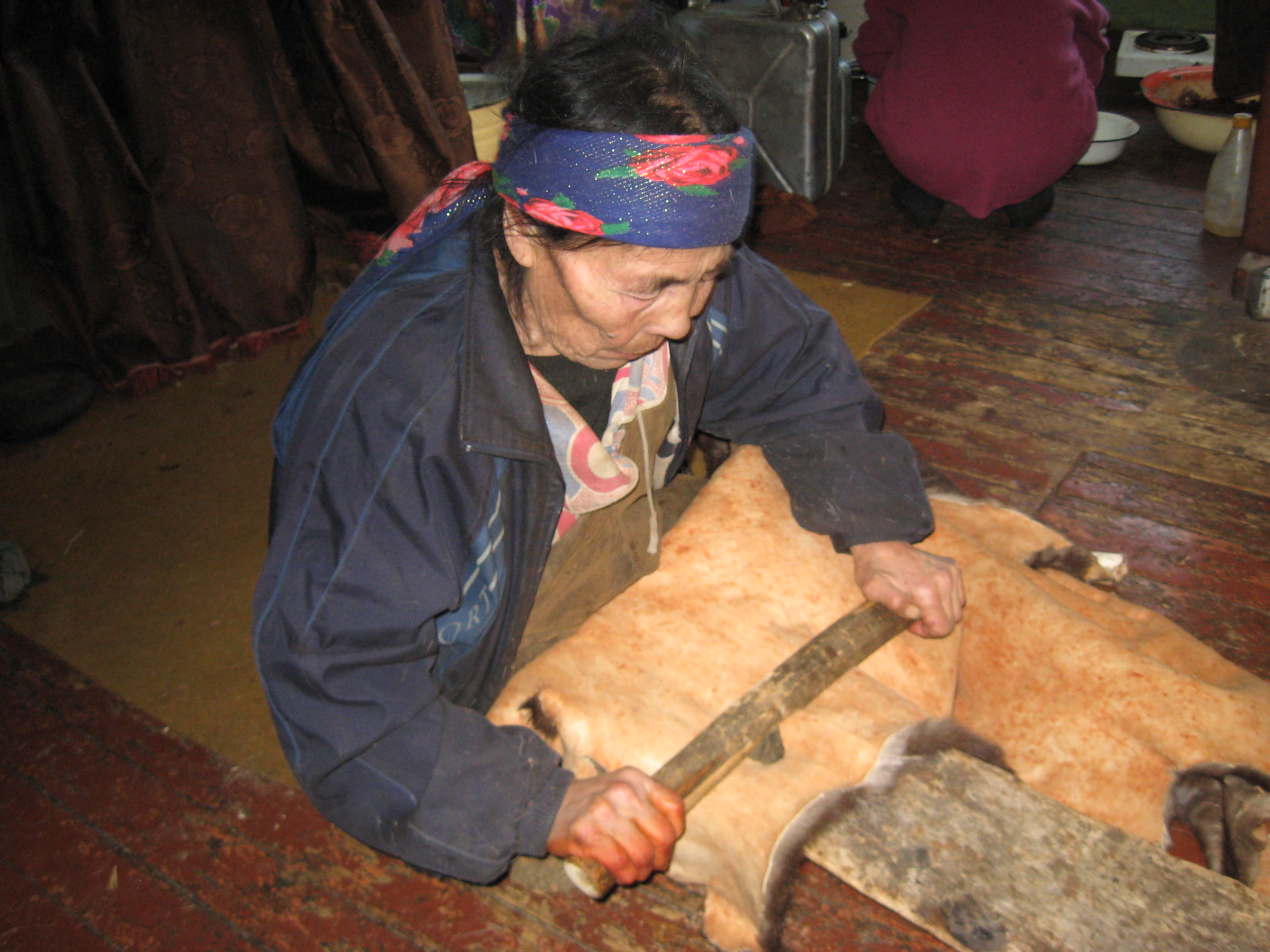 I'an lived on the edge of the village in a small wooden house, opposite the hospital. As I walked in, a very tiny Elderly Chukchi woman was sitting on the kitchen floor, stretching a reindeer skin with a stone, which was attached to a stick.