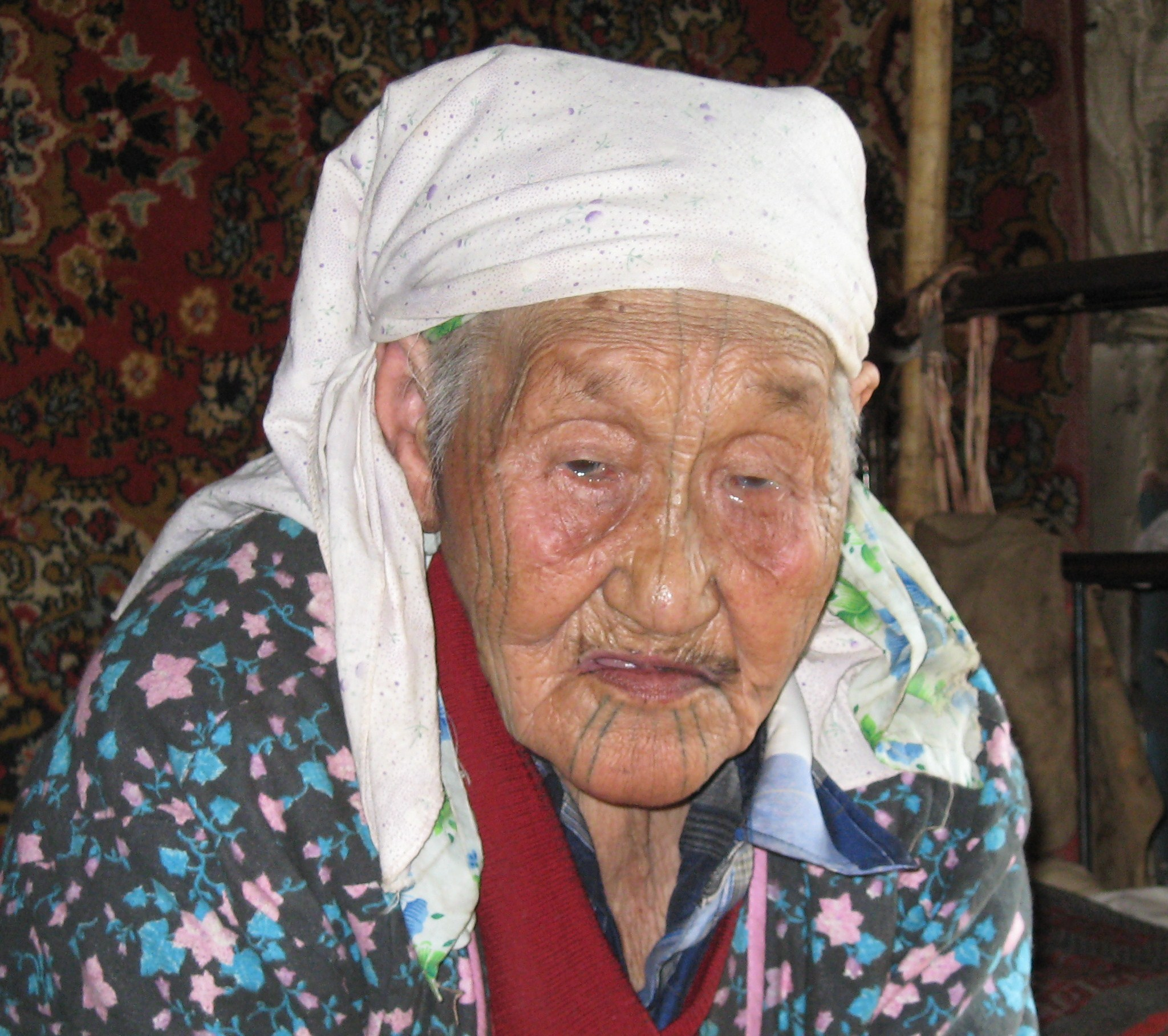 Tinatval was a dignified looking Elder. The lines of tattoos on her forehead, cheeks and chin were clearly visible. In former times, the tattoos on girls' faces were a mark of the wealth of the family. The more prosperous the family, the more lines were tattooed on their faces.