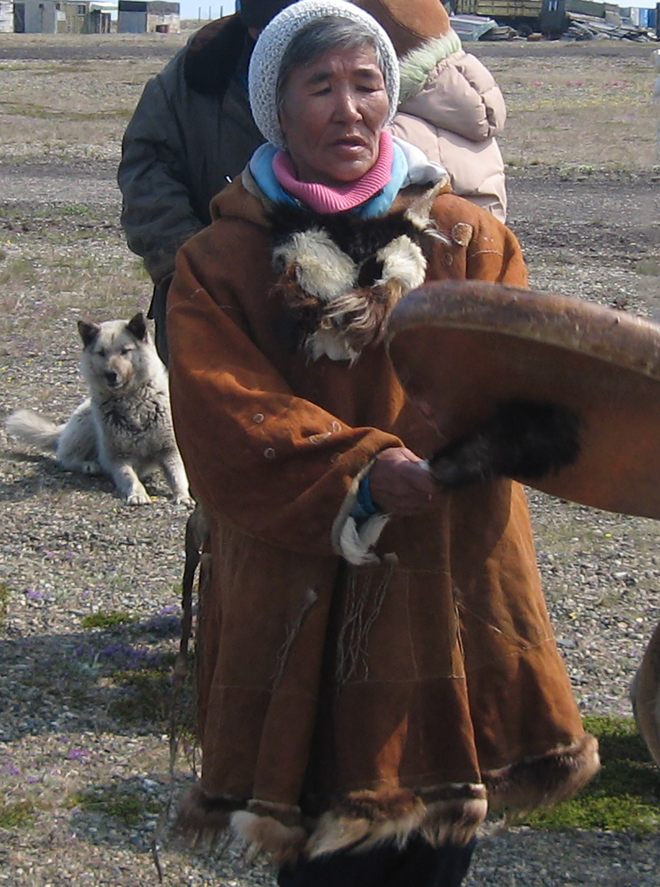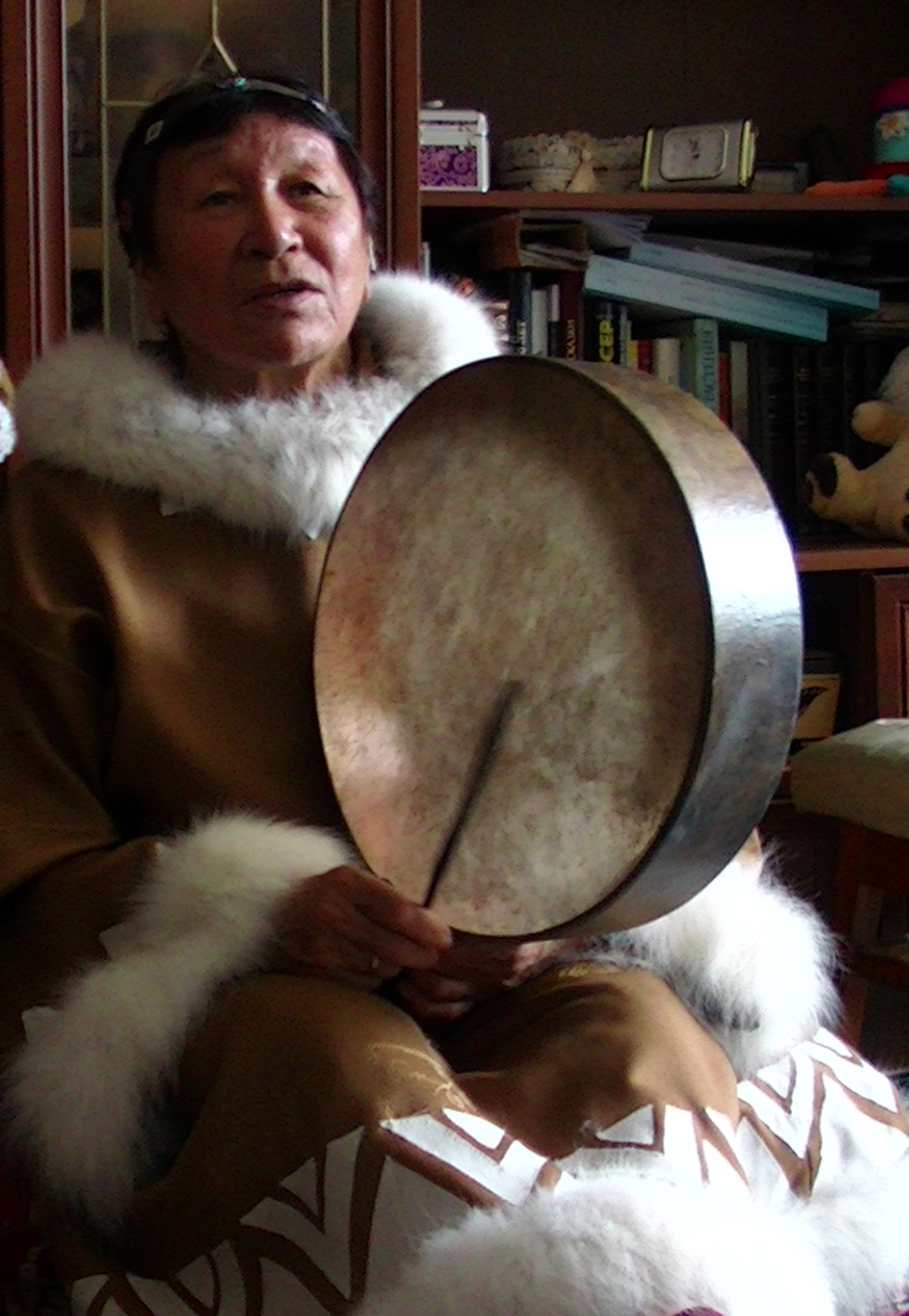 Chukchi Elder from the village of Achaivayam, who was born in the Alterngai reindeer herding camp, far from Achaivayam, and later moved to live there. She was one of the most skilful singers I met, who, apart from her own songs, remembered the songs of her family and many of the villagers. Her use of the drum was particularly expressive.