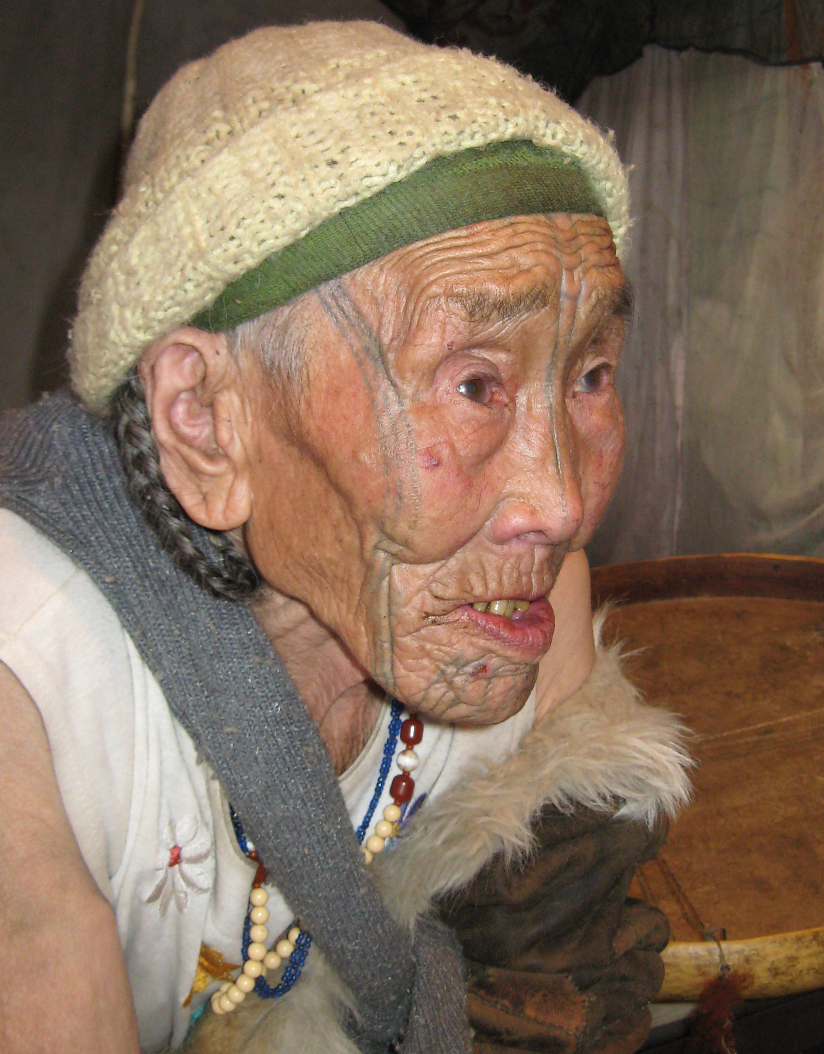 Tinatval oli arvokkaan näköinen vanhus. Tatuointiviivat hänen otsallaan, poskipäissä ja leuassa näkyivät selkeästi. Ennen tyttöjen kasvojen tatuointi oli perheen vaurauden merkki. Mitä rikkaampi perhe oli, sitä enemmän viivoja tatuoitiin.