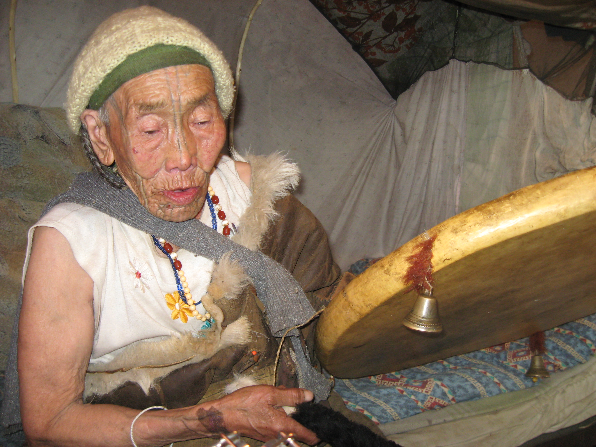 It was especially noticeable how diverse and full of expression I'an’s drum playing was. Her playing progressed from being gentle to powerful, according to the atmosphere of the music. Rhythms in 5 and 7 were very common. The songs of her youth were short and simple, yet cheerful and rhythmically very lively. Some of the melodies moved within a very broad diapason, using large intervallic jumps. In comparison to western traditions, the melodies sounded rather modern. Sometimes she was humming quietly and her version of a lullaby remained vividly in my ears, despite the fact that I heard it performed by others later. She taught me how to imitate a crow and burst into laughter at my attempts. Through music we became friends immediately.