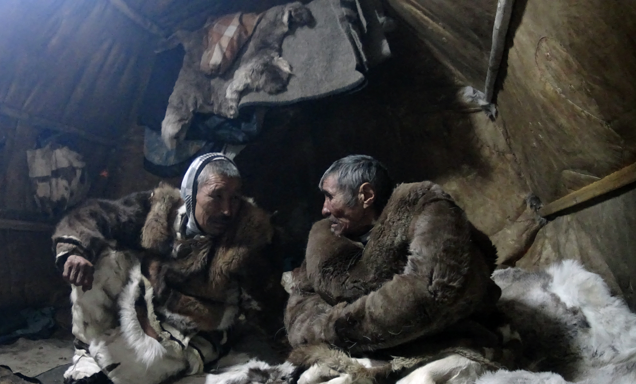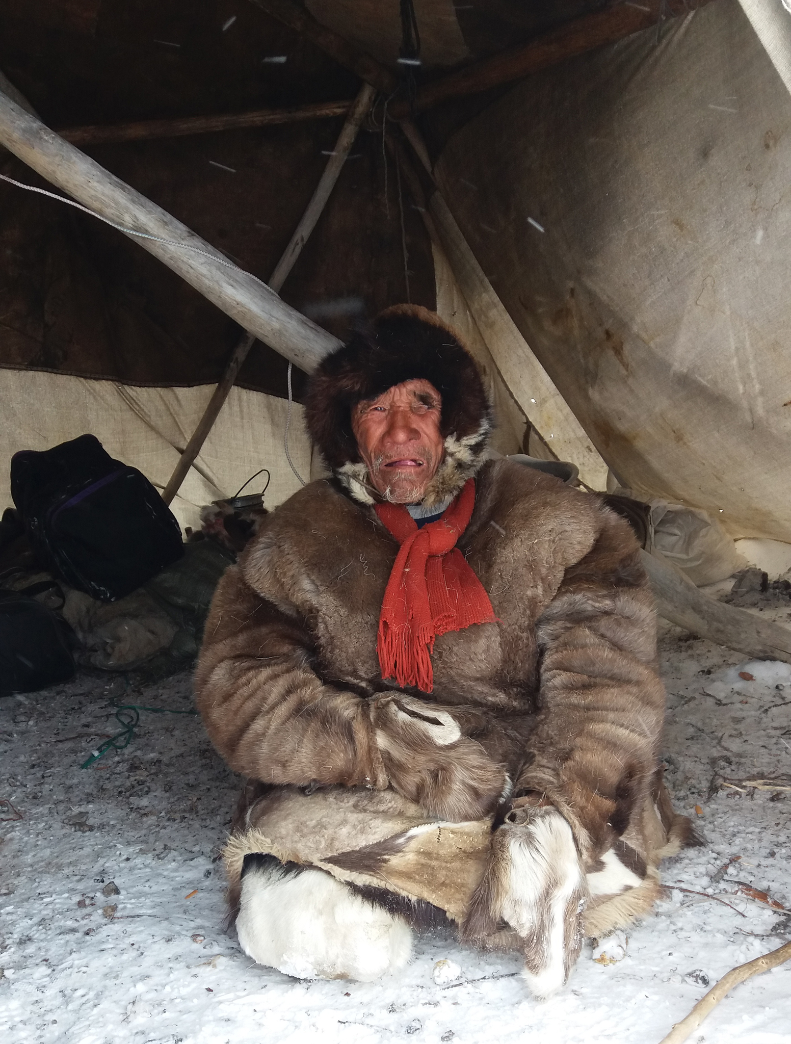 Tapasin Tingaanin päivää ennen lumimyrskyn alkamista. Olin jo kesällä 2016 kuullut tästä lähes 80-vuotiaasta poromiehestä, joka yhä asui tundralla, vaikka joutui jo liikkumaan kahden kepin varassa. Hän ei ollut käynyt kouluja eikä puhunut venäjää. Hänestä sanottiin, ettei hän ole laulavaa sorttia, mutta olin kiinnostunut tapaamaan hänet. Useimmat hänen ikäpolvensa poromiehet asuivat jo kylissä.