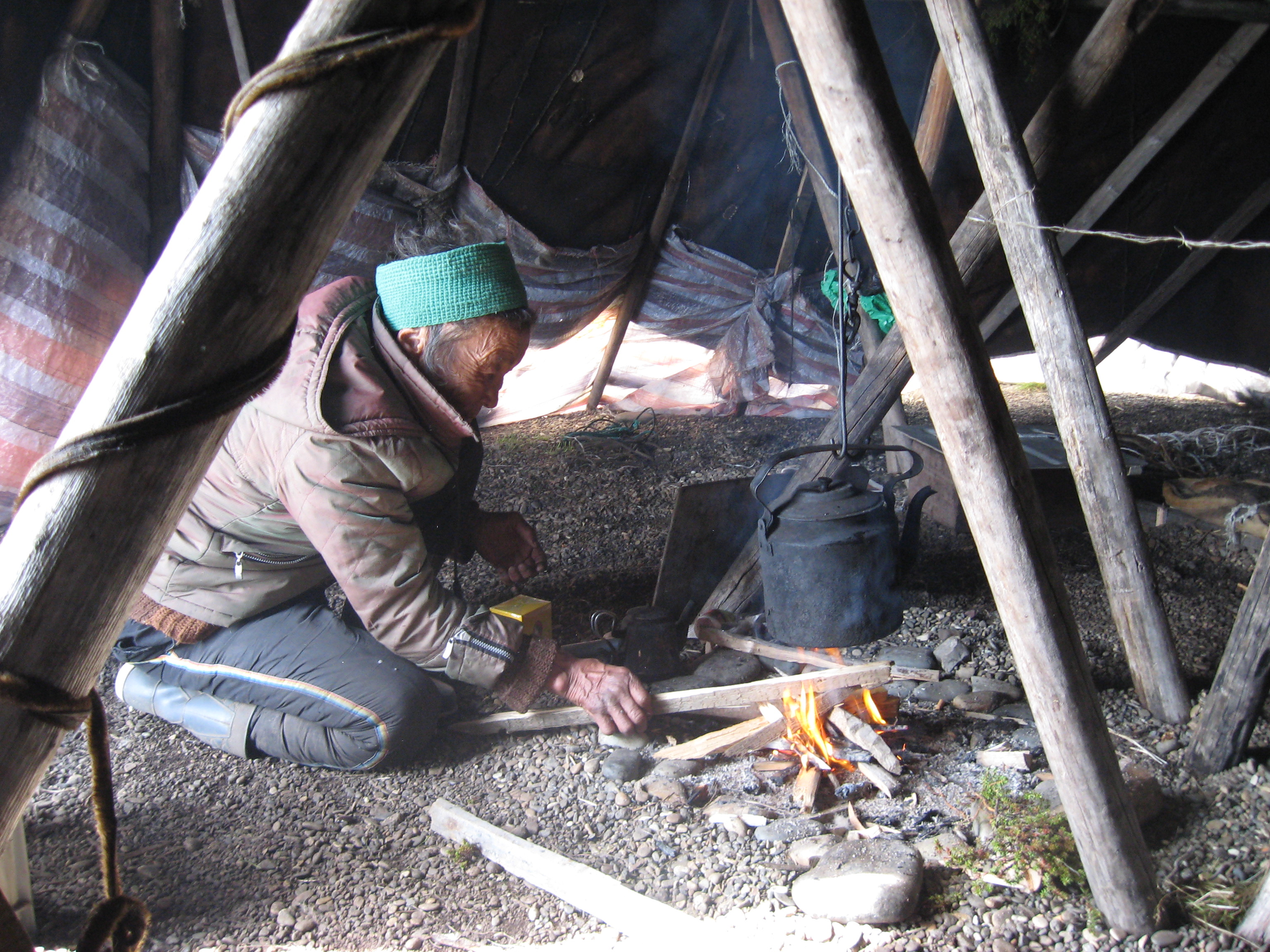 It was a misty morning as I walked to Tevlyantonau’s teepee. It was erected by the coast beside an enormous mound of rusty canisters. The low teepee had been haphazardly erected from a couple of planks, which were partly covered by some oilcloth and cloth. Inside there was a fire burning and by the fire there was an old granny with glasses. She sang to me a little but began to complain that it wasn't good for her heart. We were having some tea when a relative paid a visit to the Tepee and decided to repair its wobbly structure. Tevlyantonau sang some short fragments, but was interrupted several times, either by the noise of the relative fixing the Tepee, or just by her own thoughts, which seemed to be drifting elsewhere. She said that if I came another time with a drum, she would sing for me again.