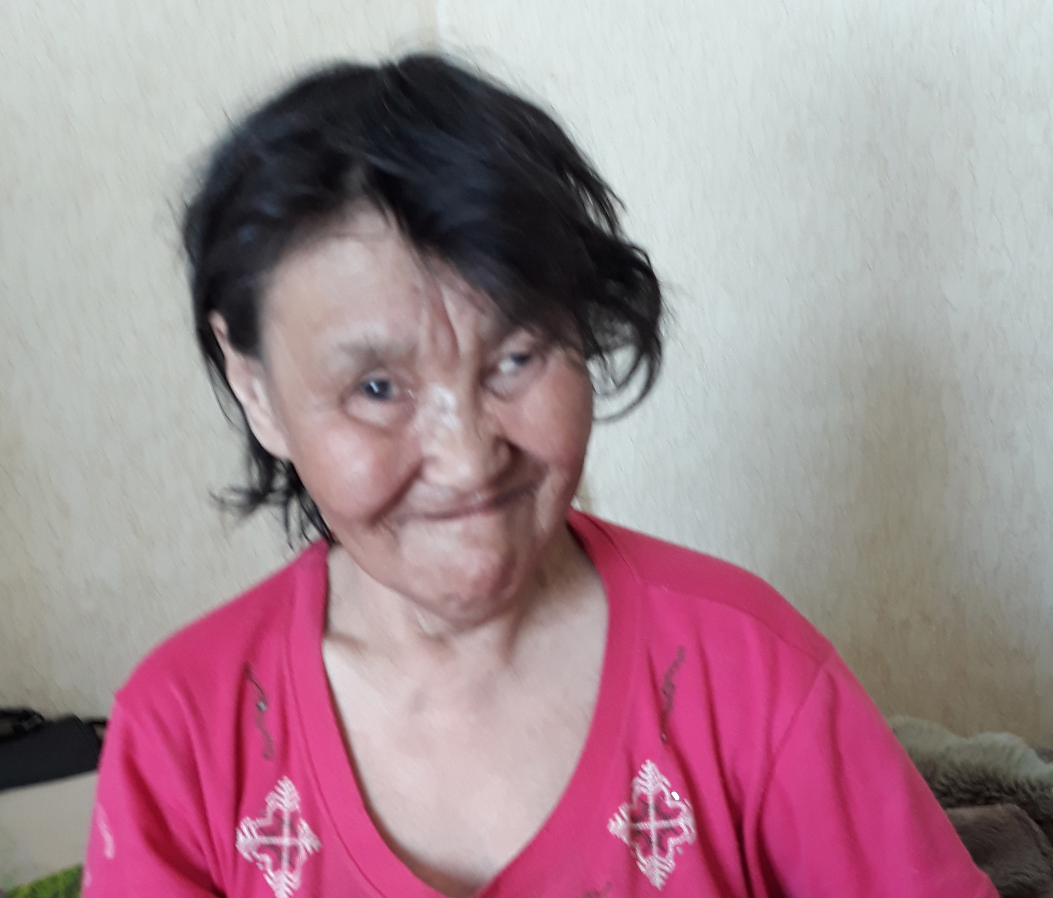 We went to visit Eingevngeut who shared a flat with her son in a two-storey building. She was in bed because she felt unwell, however we still stayed for tea. I gave her my gifts and she gave me dried fish and a long strip of dried reindeer. I asked her whether she remembered any old songs and she began to quietly hum a simple melody, but then complained about her cough.