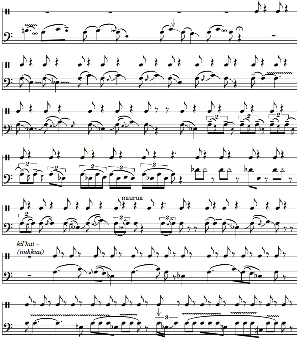 Telvjanto tarjosi minulle maukkaan aterian ja juodessamme teetä hän kertoi elämästään Val’karain tundralla. Hän oli ensimmäinen tšuktši, joka puhui henkilölaulujen (sinitkin grep tšuktšiksi) lisäksi myös suvussa sukupolvelta toiselle kulkevista esi-isien lauluista, joiden nimet eivät enää olleet tiedossa. Näitä lauluja pidettiin hänen mukaansa suuressa arvossa. Sahalinissa tätä termiä käytettiin usein, mutta siellä toisaalta kuullut kenenkään puhuvan henkilölaulusta. On outoa, että kukaan muu ei kertonut tällaisten laulujen olemassaolosta. Ehkä muut, jotka lauloivat vanhoja lauluja, tiesivät nämä esi-isänsä nimeltä. Tevljanto istui lattialla ja alkoi rummuttaa nopeasti ja keveästi kumeasti soivaa rummunkalvoa joustavalla valaanhetulasta tehdyllä sauvalla, joka pompahti itsestään kalvolta ja sai aikaan pisteellisen rytmin. Hän aloitti kaikki laulunsa kertomalla jonkun tarinan ja samalla säesti itseään rummuttamalla hiljaa.