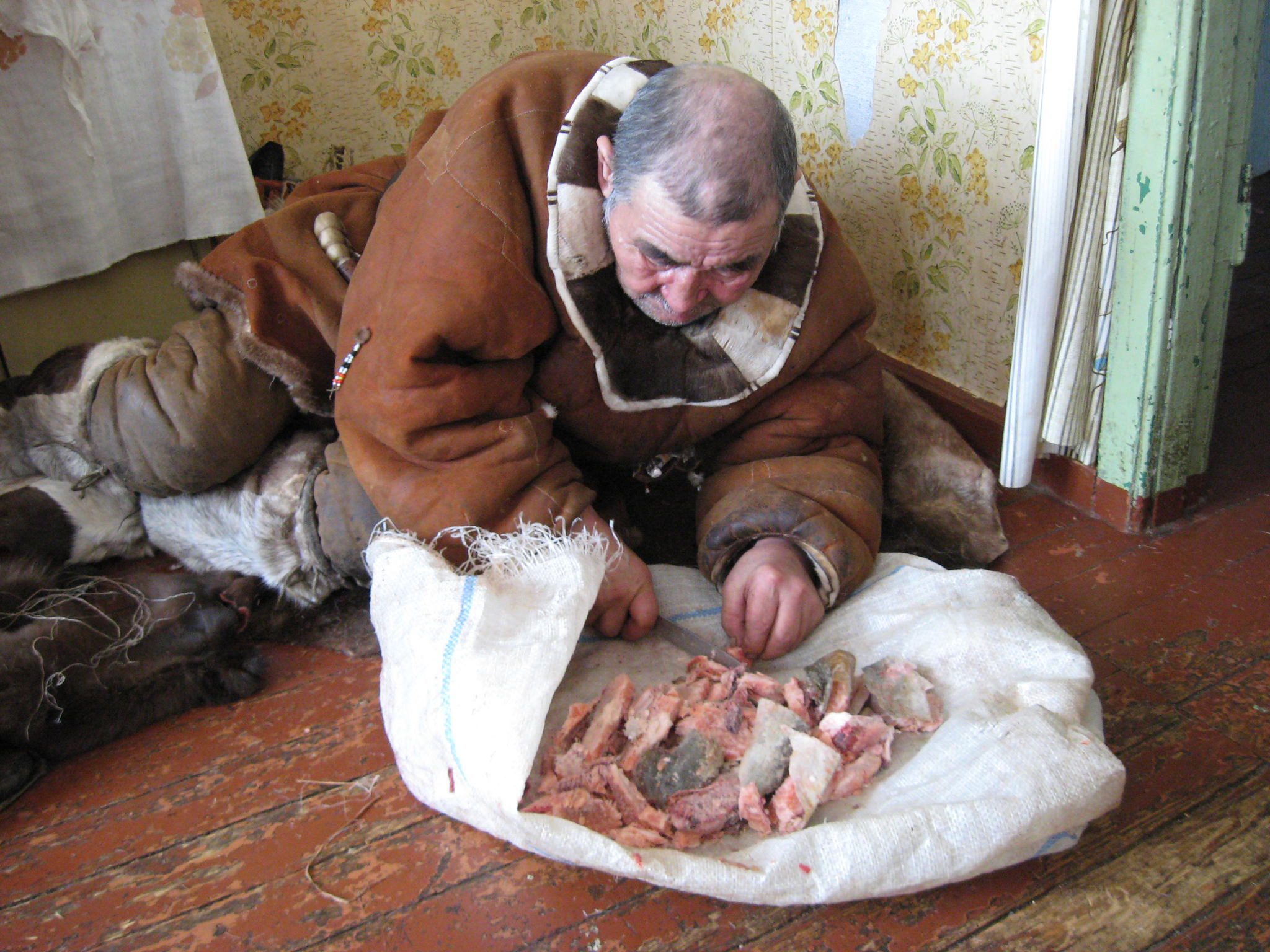 I'an asui kylän laidalla pienessä puutalossa kyläsairaalaa vastapäätä. Astuessani sisään keittiön lattialla istui hyvin pienikokoinen tšuktšinainen pehmittäen poron nahkaa puupalikkaan kiinnitetyllä kivellä.