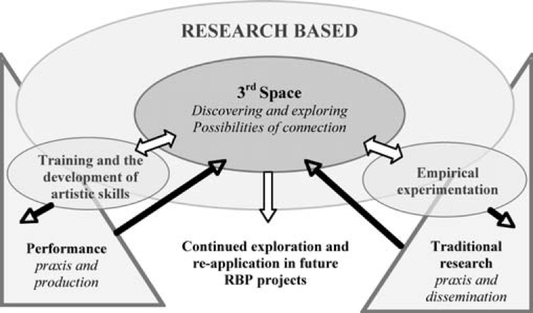 3) Following the articulation of the interdisciplinary conceptual framework, I will conduct an initial 2-week exploratory ‘laboratory’ with four artists from distinct disciplinary backgrounds. The laboratory will utilize a Research-Based Practice (Hansen & Barton 2008—see diagram) research-creation methodology, facilitated jointly with my collaborator on this project, Dr. Pil Hansen.