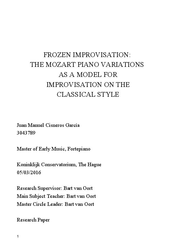 Name: Juan Manuel Cisneros García Main Subject: Forte Piano Research Supervisor: Bart van Oort Title of Research: Frozen improvisation: The Mozart piano variations as a model for improvisation on the Classical Style Summary of Results: The fourteen sets of piano variations composed by Wolfgang Amadeus Mozart are a sort of microcosmos of his whole pianistic output. Their complete composition covered practically his entire lifetime, from 1766 to 1791 and some of them were originated in actual improvisatory performances. Considering also the historically documented connections between the variation genre and the extemporization practices, this research is focused on their study as models for learning improvisation on the Classical style. With this purpose, I am using a concrete methodology that is being developed now in Spain (IEM methodology) that places the improvisation in the core of music education, with special emphasis in the use of patterns extracted from the musical sources. This has been combined with the historically informed performance practice in order to develop a repertory of exercises and proposals to be used as a guided practice for this learning process. Biography: Juan Manuel Cisneros (Málaga, Spain, 1978) is pianist, composer and teacher. He has a Bachelor´s degree on Piano (Conservatoire of Málaga), Phylosophy (University of Málaga) and Composition (Conservatoire of Granada). He completed his studies as composer and pianist in the Centre Acanthes (Metz, France), among other musical institutions. He is currently performing in several ensembles, from early music to jazz, in Spain, France, Holland, Italy and Romania. His passion for historic keyboard instruments led him to the fortepiano and the harpsichord in recent years. He is developing an extensive activity in the field of historic improvisation, with frequent lectures, concerts and workshops in Spain and abroad. He is composition and improvisation teacher at the Conservatoire of Granada and teacher member of the IEM (Music Education Institute) methodology.