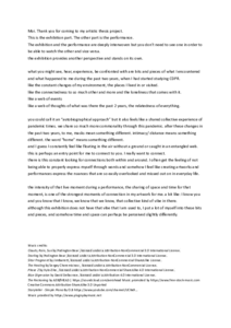 The exhibition space is a white studio with white curtains dividing the space into a spiraling corridor. Before you enter, you will perhaps first notice the installations of chains hanging from the ceiling over a hospital bed furthest from the entrance or the mannequin dressed in a bee suit closest to the entrance. As you take off your shoes, put them onto the provided shoerack, you may enter the white space. After passing the mannequin there would be a projection of a dance video on the floor. A rhythmic minimalistic music showering you from up top, you see the snowy cityscape of Helsinki, the huge pile of coal afar covered in snow, the chimney keeps churning white smoke, an empty street with a person dressed in a bee suit dancing and traveling in somehow robotic and dynamic movement echoing the music. You can choose to view it standing or at the chairs nearby. Next to the chairs is a tea table with a printed photo album of the same bee suit person. The album starts with a poem that was written when I first arrived in Helsinki. (show the poem and pics) Only by going through the whole album can you see the person's face underneath the veil of the bee suit. As you move on, the music fades away, you get a closer look at the chains and bed. The lights illuminate the entangled chains and create a dark web of shadows on the white curtain behind, giving a stronger presence of the chains. Next to the bed is a small fishtank with a little orange fish. You can hear the flickering sound of the fish which might be strange at first, but if you take a closer look, you realize that it is a mechanical fish and that explains the strange sound it creates as it “swims”. The light beams on the water and creates a rainbow reflection. You start to hear another music, there is a hanging frame with another projection of moving images. What is shown is different fishes in an aquarium, you decide to move to the corner and sit to watch the whole video. The music accompanying the lively fishes is cheery, reminding you of a music box from your childhood. Then the music gradually changes into something more mysterious, along the projection of some black and white images of a city unknown to you, you see closeups of a person’s skin, the skin is marked with ink, the camera works like a probe circling closely around the skin, you can tell it is windy by the hair blown in the air. You turn to your right and see an old chunky TV at the dark corner, you walk over and see a remote control and a headphone. Putting on the headphones you start to look at the menu of the media files and notice that they are the dance documentation of Christy and Vincent’s journey. Although you cannot see the face of Vincent, you can tell his aesthetics through his cinematography. Leaving the corner, returning to the main path of the exhibition, you walk to the last area of the exhibition, between the curtains, you can already hear the dialogue from another projection. But before going there, you see a blackboard, similar to what they have in school. On it are different handwritings, it takes you some time to realize that the writings are responding to this question “how did the pandemic affect you?”. You notice how things are different at different places for different persons. Then you turn around and continue to walk further inside, it is a comparatively bigger space than the corridor, there’s a sofa at one side where you can sit down to watch the projection or you can go towards a small desk with a little desk lamp lit there. You decided to take a quick look at what else is on the desk first, there are a few books, papers, and a cassette recorder. You then move on to the sofa and look at the video. The video is in Cantonese with English subtitles. There’s one part where Christy gives a monologue in English, looking into the camera, talking about suicide, speculating near the threshold between life and death.
