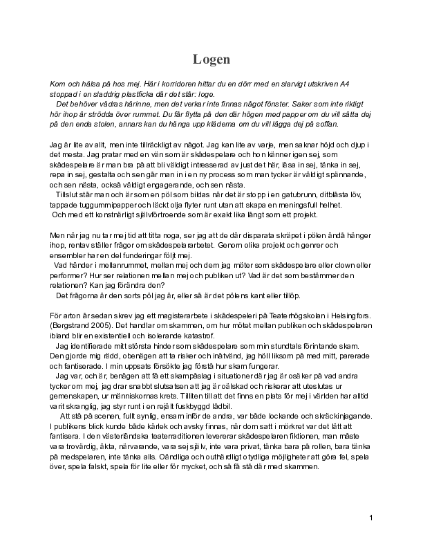 This exhibition shows my project from the Master in Acting 2021-2023 at SKH in Stockholm. The essay is called "When we meet" and the performative part "How do we let the audience in?" As an actor and clown, I have worked in many different rooms and with many different audience agreements. Everything from stage-salon situations where the audience knows exactly how to behave and what their participation looks like, to playing for only one person in a hospital bed or in a small rowing boat, where participation must be clearly negotiated and communicated. I've met adults who are world masters of theater etiquette, but can't answer a question if asked from the stage, and I've met children who are wild first-timers who engage in intense dialogue with us on stage. I am interested in the dialogue between actors and audience and in audience participation. What standards and agreements are they regulated by? How does the fear of making a mistake, breaking the norm, affect the experience of the performance? Does that fear of shame limit what is possible in the theater? I have also wondered what roles the audience can have, what in a work communicates this role, and whether the audience can change roles in the same work. In "How do we let the audience in?" you can read about the work with Eva and Margaretha, two half-masks who are both actors but in whose artistry the audience plays very different roles.