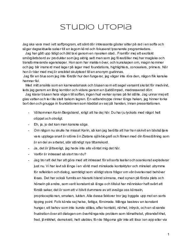 This exhibition shows my project from the Master in Acting 2021-2023 at SKH in Stockholm. The essay is called "When we meet" and the performative part "How do we let the audience in?" As an actor and clown, I have worked in many different rooms and with many different audience agreements. Everything from stage-salon situations where the audience knows exactly how to behave and what their participation looks like, to playing for only one person in a hospital bed or in a small rowing boat, where participation must be clearly negotiated and communicated. I've met adults who are world masters of theater etiquette, but can't answer a question if asked from the stage, and I've met children who are wild first-timers who engage in intense dialogue with us on stage. I am interested in the dialogue between actors and audience and in audience participation. What standards and agreements are they regulated by? How does the fear of making a mistake, breaking the norm, affect the experience of the performance? Does that fear of shame limit what is possible in the theater? I have also wondered what roles the audience can have, what in a work communicates this role, and whether the audience can change roles in the same work. In "How do we let the audience in?" you can read about the work with Eva and Margaretha, two half-masks who are both actors but in whose artistry the audience plays very different roles.