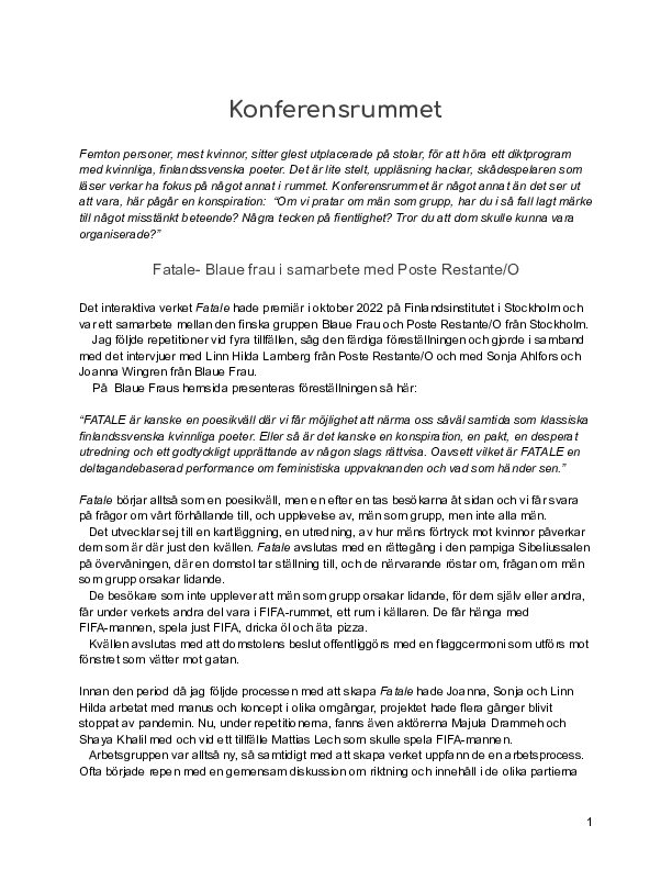 This exhibition shows my project from the Master in Acting 2021-2023 at SKH in Stockholm. The essay is called "When we meet" and the performative part "How do we let the audience in?" As an actor and clown, I have worked in many different rooms and with many different audience agreements. Everything from stage-salon situations where the audience knows exactly how to behave and what their participation looks like, to playing for only one person in a hospital bed or in a small rowing boat, where participation must be clearly negotiated and communicated. I've met adults who are world masters of theater etiquette, but can't answer a question if asked from the stage, and I've met children who are wild first-timers who engage in intense dialogue with us on stage. I am interested in the dialogue between actors and audience and in audience participation. What standards and agreements are they regulated by? How does the fear of making a mistake, breaking the norm, affect the experience of the performance? Does that fear of shame limit what is possible in the theater? I have also wondered what roles the audience can have, what in a work communicates this role, and whether the audience can change roles in the same work. In "How do we let the audience in?" you can read about the work with Eva and Margaretha, two half-masks who are both actors but in whose artistry the audience plays very different roles.